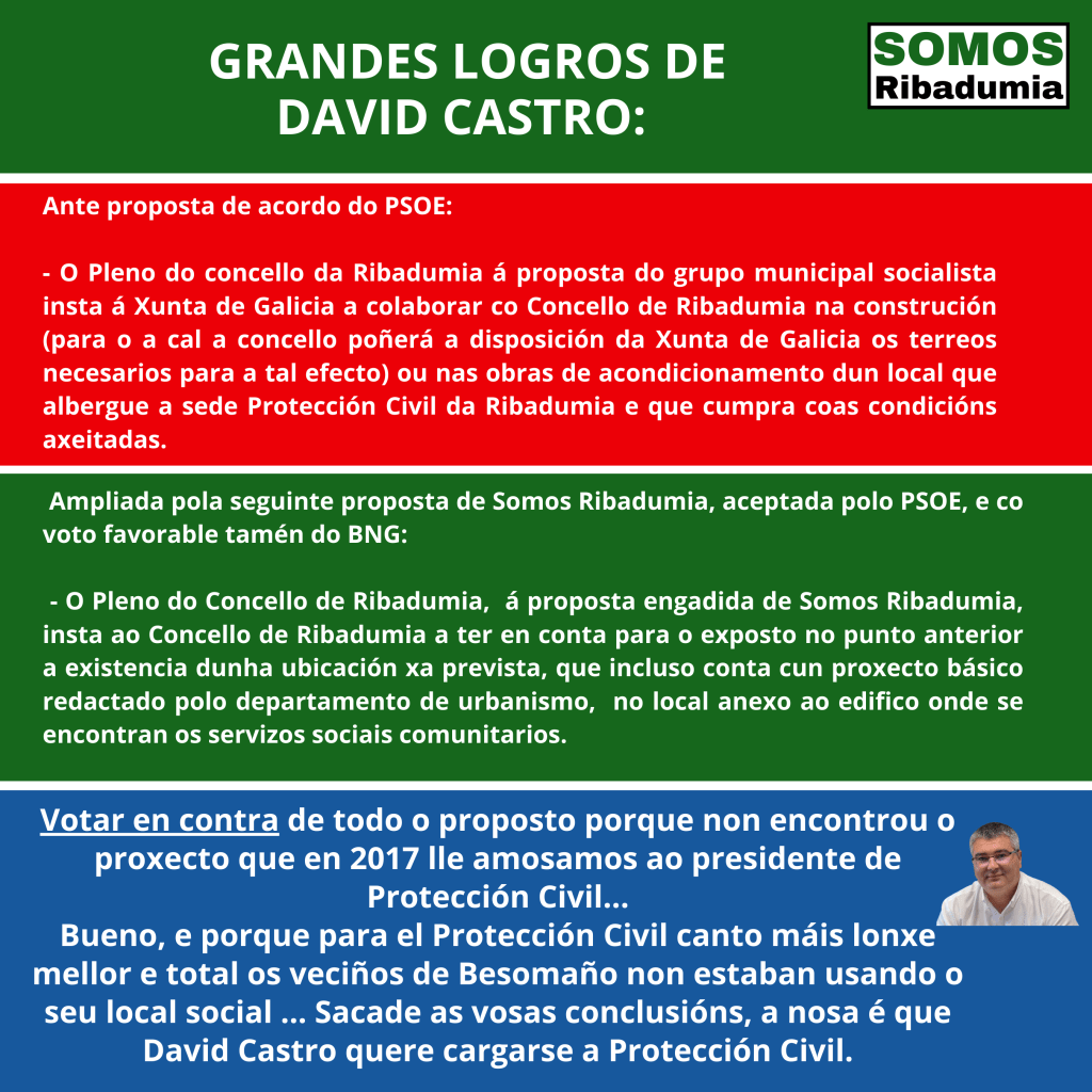 Contra todo pronóstico, pois o PP había dado voto favorable na Comisión Informativa, David Castro, que confirmou a existencia da proposta que expuxo Sergio Soutelo chegando incluso a colgarse a medalla da mesma , cambiou o paso, e baseándose en que segundo el non existe o proxecto básico do que falamos dende Somos Ribadumia , él e o seu grupo votaron en contra desta moción, dando a entender que Protección Civil vai seguir onde está e que non ten ningún interese en dotarlles unha sede adecuada, e de feito é evidente polas súas declaracións que ese corpo de voluntarios a David Castro estórballe.