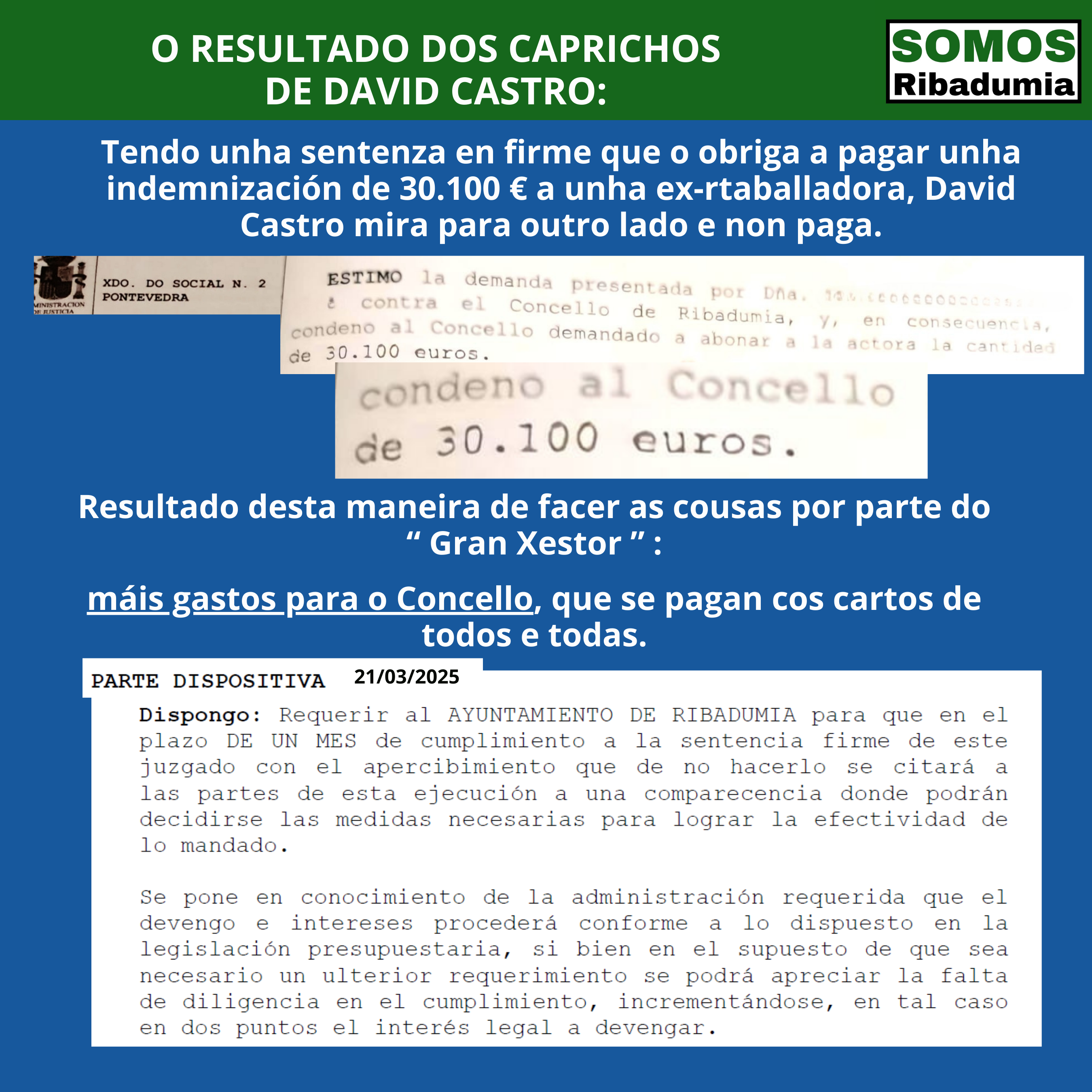Este pasado xaneiro facíamos público o desestimento de David Castro ante unha sentenza que obriga ao Concello de Ribadumia a aboar unha indemnización de 30.100 € a unha traballadora, logo de cinco anos de gastos nunha loita meramente personalista.