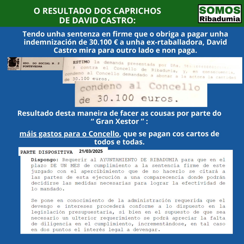 O pasado 14 de marzo cumpriuse o prazo para pagar a indemnización a esta traballadora, pero o señor Castro fixo oídos xordos ao mandato xudicial e non pagou a indemnización. Ao actuar deste xeito o único que conseguiu foi que a afectada presentase unha solicitude de execución de sentenza, que xa tivo resposta por parte da xuiza este pasado venres, requerindo o pago da indemnización, cos correspondentes intereses de mora, no prazo de un mes, coa advertencia de que no caso de non cumprirse a sentenza poderá haber outras consecuencias, polo que se David Castro insiste en non pagar o que debe, o Concello podería rematar cunha intervención dos bens públicos. En calquera caso, de partida aos 30.100 € agora hai que sumarlle os intereses xerados por non pagar en tempo e forma, así que á veciñanza xa lle está saíndo máis caro, e sen ningún tipo de xustificación. Recordemos que cada euro que David Castro mete en avogados e en procesos deste tipo, pérdese de investir noutro tipo de actuacións en beneficio de toda a veciñanza.
