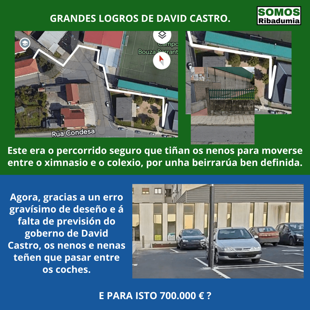 E para rematar unha breve nota sobre o custo das obras. A nós as contas non nos saen, e xa o dixemos no 2023 cando se anunciou a obra. En concreto non nos cadra o custe declarado para o Concello, que creemos foi moi superior aos pouco máis de 211.000 € que se dixo, entre outras cousas porque os peches dos retranqueos e o derrube do local onde estaba Protección Civil non figuraban no proxecto, e a isto hai que sumarlle os 163.000€ da compra da parcela onde se fixo o novo aparcadoiro. Ademais, compre recordar que David Castro perdeu no seu momento 1.300.000 € en axudas de dous Plans da Deputación por que se negaba a aceptar a titularidade do tramo de vía afectado e a pagar o 30% das obras, condicións que ao final tivo que tragar, polo que esta obra pode considerarse calquera cousa menos un triunfo de David Castro, que demostrou a súa incapacidade para negociar nada e rematou pedindo por favor os investimentos e aceptando todas as condicións postas pola Deputación, naquel momento gobernada polo PSOE. Porque esa é a outra gran mentira do señor Castro e do señor Luís Lopez: o PP non puxo un euro nesta obra, o que veu foi todo da man do PSOE.