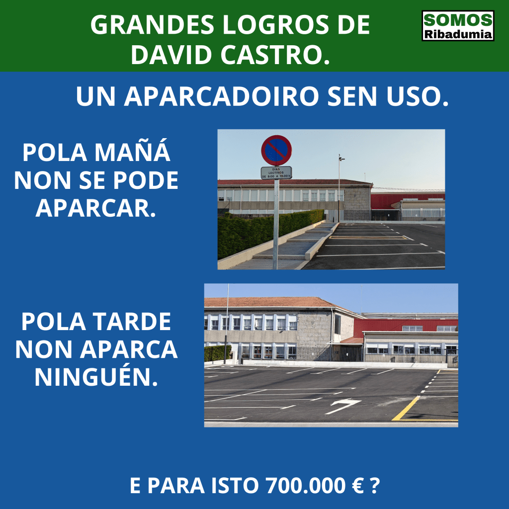 Dende Somos Ribadumia xa dixemos no seu momento que eliminar ese aparcadoiro sen dar unha alternativa viable era un erro. Pero David Castro, mais centrado prexudicar ao Umia C.F que en solucionar problemas, non quixo atender a mais razóns que as súas, e o resultado é que onde antes había máis de setenta prazas de aparcadoiro, agora so quedan 25. Porque esta é a realidade. David Castro declarou que a zona pasou de 20 prazas a 75, e iso é unha completa falsidade, porque ao prohibir o acceso á explanada onde ata agora aparcaban os coches, eliminou esa bolsa de aparcadoiro que se usaba polas tardes e nas fins de semana, e polo tanto na conta hai que restar todas esas prazas. A zona que habilitou a case 150 metros de distancia, non aporta máis prazas das que xa había dispoñibles, nin sequera sumando as novas prazas realizadas ao longo dese tramo da rúa Condesa. Polo tanto 704.000 € despois, resulta que nesa zona hai as mesmas prazas de aparcadoiro que había, senón menos e cun uso igual de restrinxido. Como é de supoñer, dende o entorno do Umia trasladan que as queixas por non ter un lugar próximo onde aparcar son diarias, pero máis especialmente nas fins de semana, cando se xuntan deportistas e pais, local e visitantes.