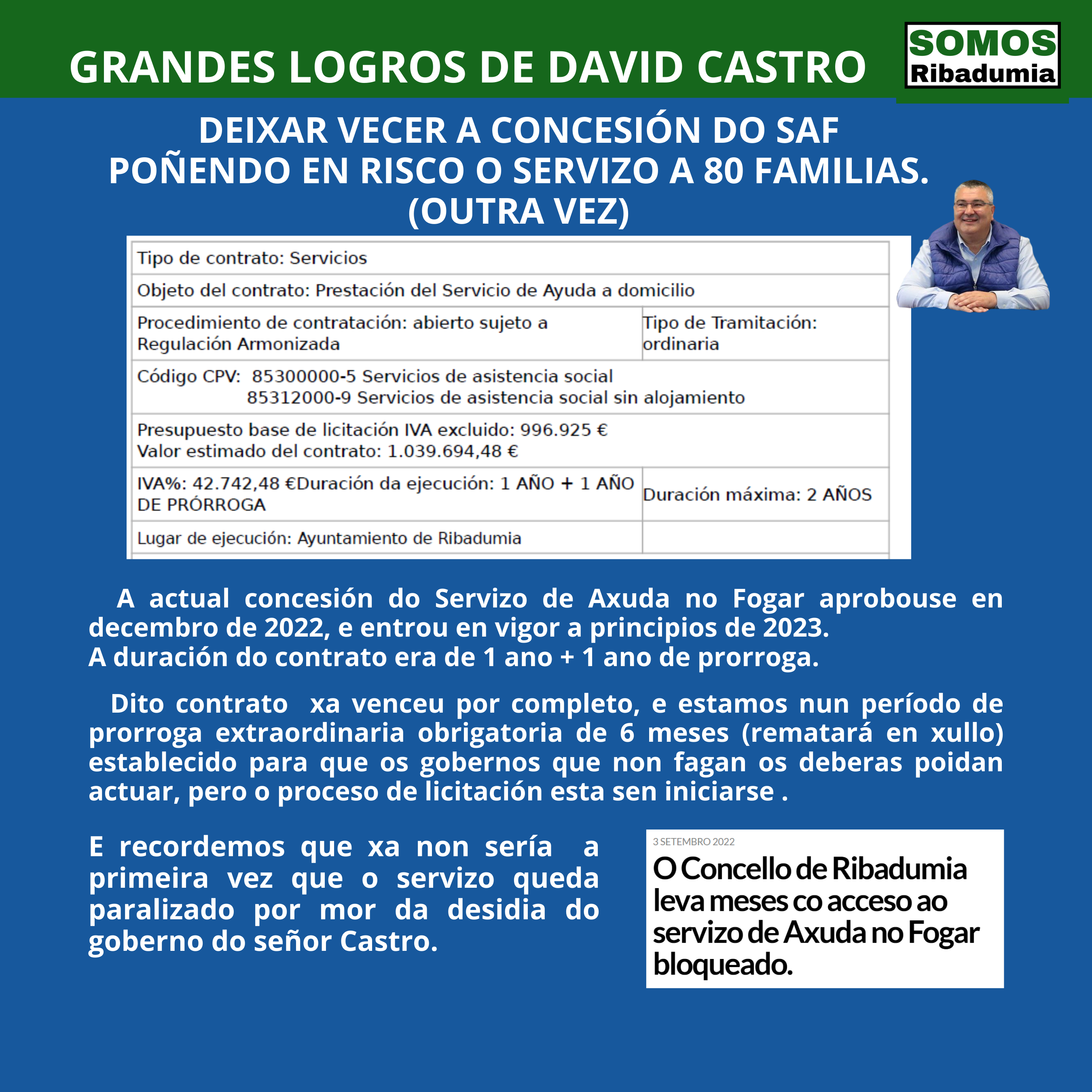 Pasan os anos e o señor Castro non aprende dos seus erros. Durante o ano 2022 vivimos unha situación dramática, con varias familias afectadas durante meses pola parálise municipal e do señor Castro, que se “esqueceu” de sacar a licitación o contrato do SAF , deixando esgotar todas as prórrogas e provocando que se paralizara a alta no servizo a familias que o tiñan legalmente aprobado e polo tanto, deixándoas sen o acceso a un servizo moi necesario que nalgún caso costa anos conseguir.