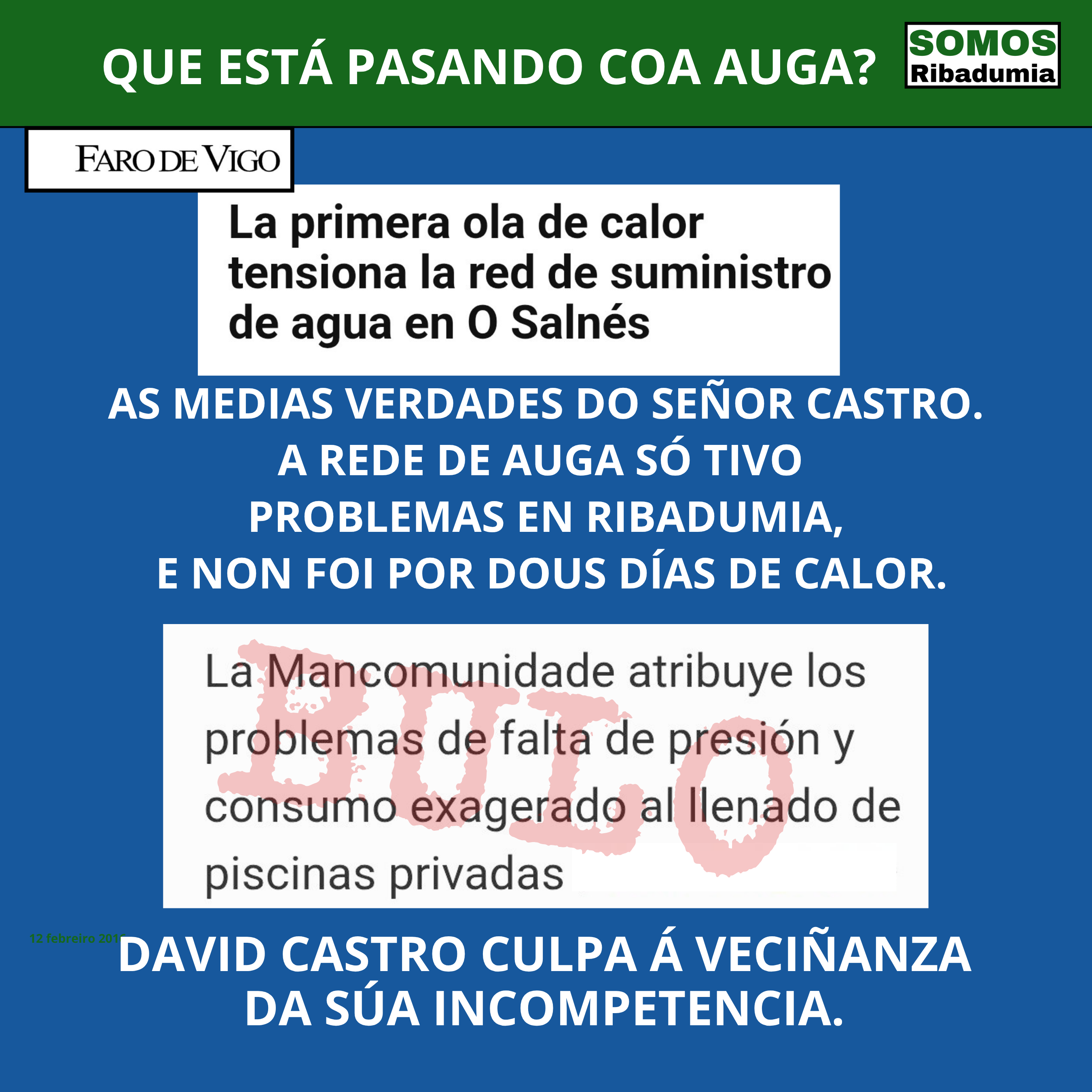 David Castro, por boca do xerente da mancomunidade culpou á veciñanza falando dun suposto enchido masivo de piscinas, algo moi lonxe da nosa realidade. Ribadumia nin ten moitas máis piscinas que anos anteriores, nin porcentualmente ten máis que outros concellos como para que haxa un problema en Ribadumia cando non o hai no resto da comarca, nin todas esas supostas piscinas se encheron o mesmo día, para empezar porque a maioría das piscinas hoxe en día están cheas todo o ano, polo que habería que falar unicamente de piscinas desmontables ou as máis pequenas, simples pozas inflables que levan moi poucos litros , pero ademais a maioría énchense con auga de pozos particulares. Para este último caso é ante as acusacións de David Castro de que a veciñanza enche as piscinas con auga da rede de abastecemento, hai que recordarlle ao señor Castro que o goberno de Ribadumia ten unha normativa sobre o uso de auga é que a súa responsabilidade como alcalde é tomar medidas para que a lexislación de cumpra. Se opta por mirar para outro lado cando menos que estea calado e non culpe aos veciños da súa propia incompetencia.