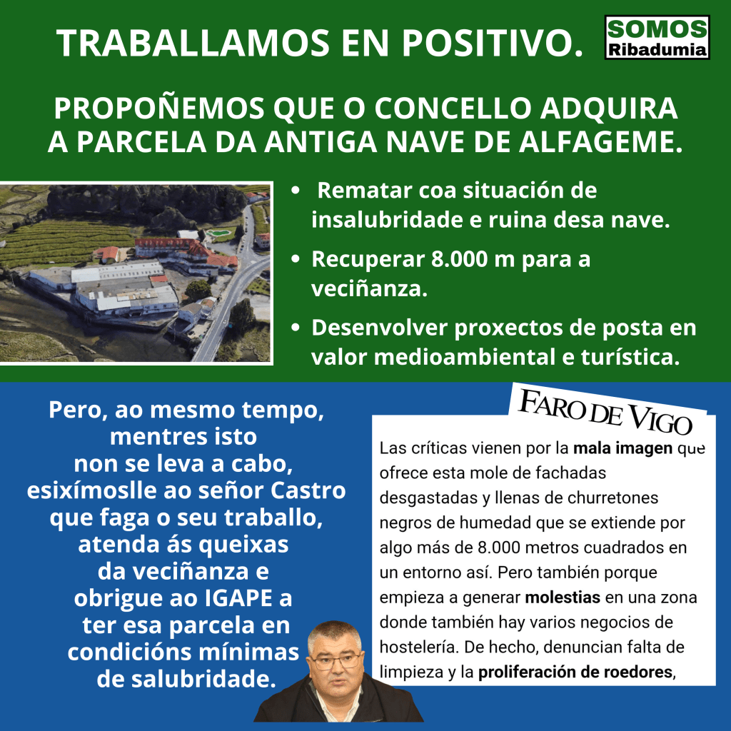 a) que leve a cabo as negociacións necesarias para que o Concello de Ribadumia dentro deste ano 2025 chegue a un acordo co IGAPE para facerse coa titularidade da parcela onde se encontra a nave da antiga Alfageme, na parroquia de Sisán.