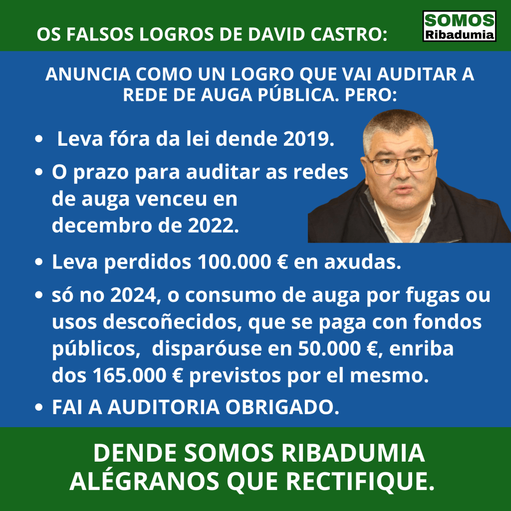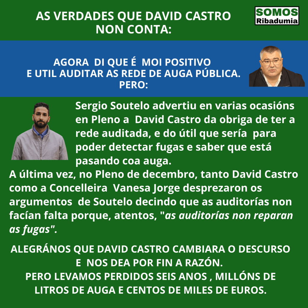 Dende Somos Ribadumia, aínda que non entendemos que un alcalde presuma nos medios de prensa de estar fóra da lei nin moito menos de que vaia a corrixir unha situación creada por él mesmo, non podemos máis que felicitar ao señor Castro por cambiar o discurso e decidir facer caso das recomendacións do noso partido, pois non esquezamos que non fai moito, en concreto nun Pleno Extraordinario celebrado en decembro de 2024, o propio señor Castro, nunha intervención deplorable e falta de todo respecto cara Sergio Soutelo, desprezaba a necesidade dunha auditoría negando que servira para detectar fugas de auga, e a súa Concelleira de Contas chegou a declarar, citamos literalmente “as tuberias rompen, van, arreglanse e xa non hai averias, enton, si que se sabe, e si que se detectan onde están [as fugas de auga]” , dando a entender que unha auditoría non aportaría nada.