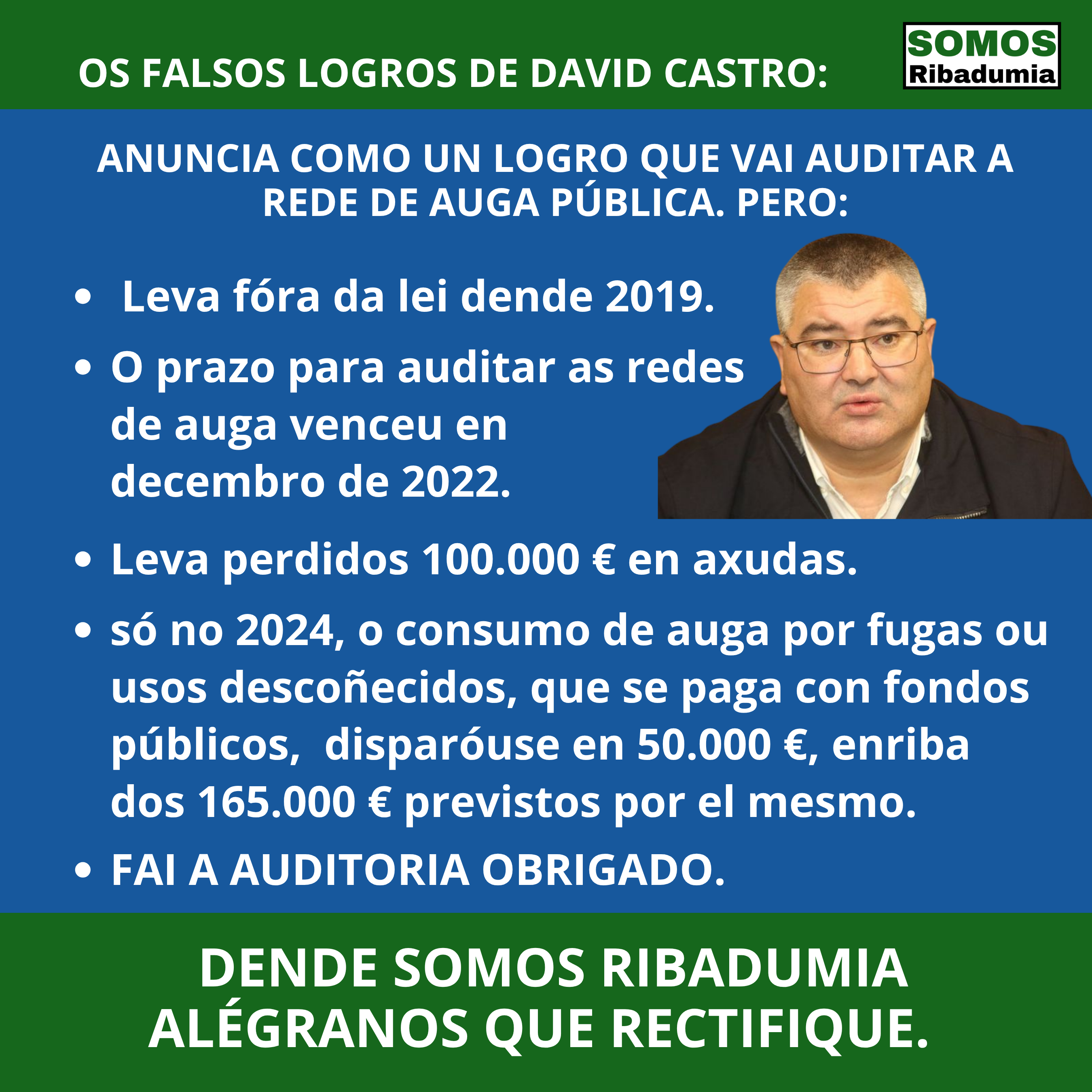 Dende Somos Ribadumia, aínda que non entendemos que un alcalde presuma nos medios de prensa de estar fóra da lei nin moito menos de que vaia a corrixir unha situación creada por él mesmo, non podemos máis que felicitar ao señor Castro por cambiar o discurso e decidir facer caso das recomendacións do noso partido, pois non esquezamos que non fai moito, en concreto nun Pleno Extraordinario celebrado en decembro de 2024, o propio señor Castro, nunha intervención deplorable e falta de todo respecto cara Sergio Soutelo, desprezaba a necesidade dunha auditoría negando que servira para detectar fugas de auga, e a súa Concelleira de Contas chegou a declarar, citamos literalmente “as tuberias rompen, van, arreglanse e xa non hai averias, enton, si que se sabe, e si que se detectan onde están [as fugas de auga]” , dando a entender que unha auditoría non aportaría nada.