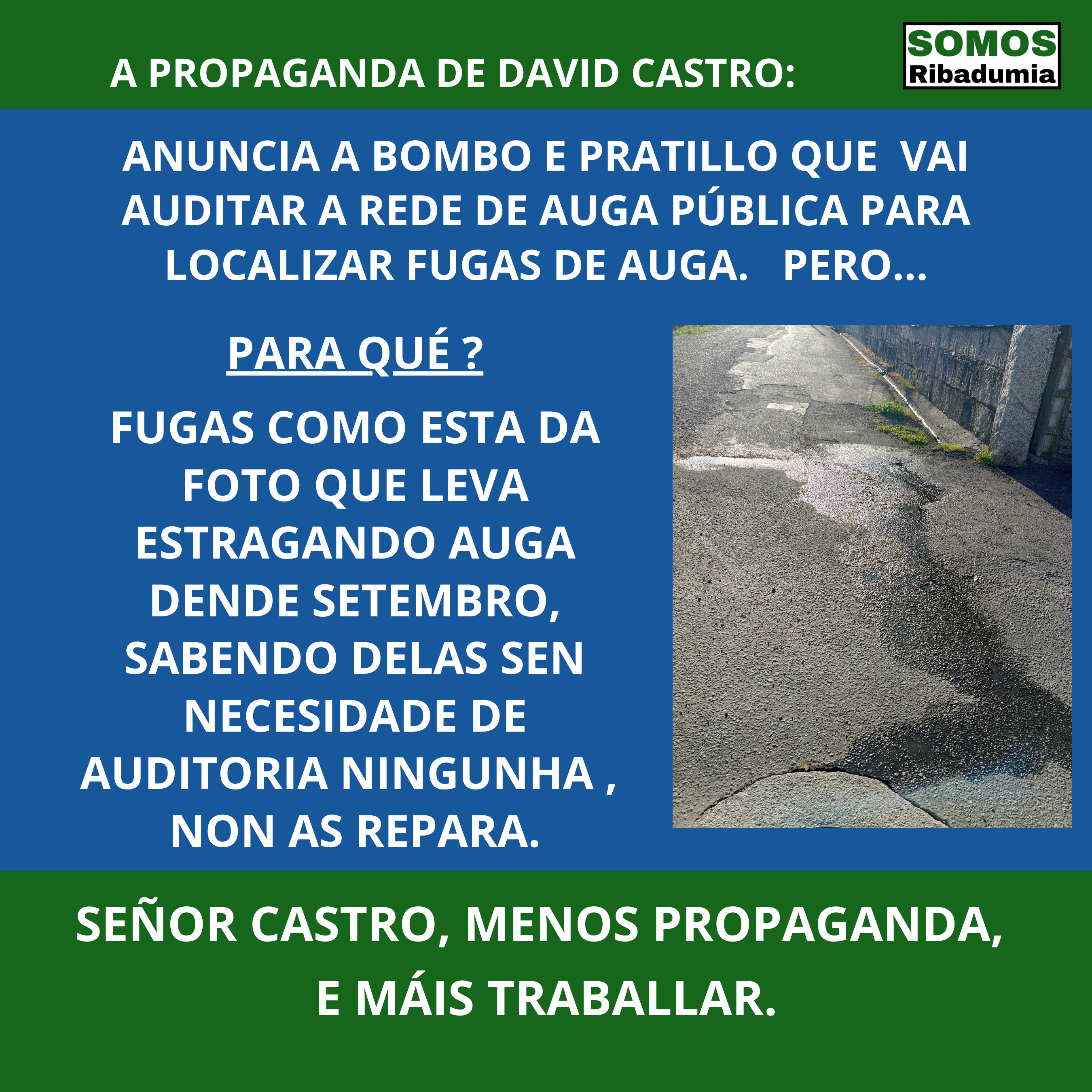 Dende Somos Ribadumia agardamos que a auditoría aclare que está pasando na nosa rede de subministro, para poder actuar ou propoñer actuacións concretas e efectivas. Pero mentres tanto, recordámoslle ao señor Castro que no Concello hai fugas de auga á plena vista, que non requiren de ningunha auditoría para saber delas e das que o goberno está perfectamente informado, e algunhas levan meses sen solucionarse.