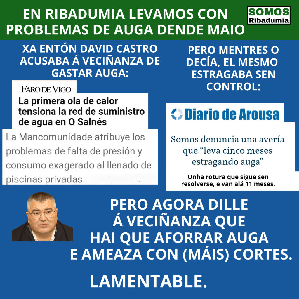 Como dixemos fai uns días, a Xunta de Galicia dende 2019 obriga aos Concellos a ter auditadas as redes de distribución de auga. Somos conscientes de que varios Concellos da Comarca fixeron esas auditorías e traballaron e seguen traballando por eliminar cando menos as fugas máis importantes. Pero non todos os Concellos. Un deles Ribadumia, que logo de anos negándose a realizar esa auditoría tena agora en marcha , en pleno verán e plena seca, polo que calquera resultado chegará en outono, e as solucións con este alcalde quizais nunca. Parécenos moi lamentable que o alcalde que preside a Mancomunidade sexa dos poucos coa rede sen auditar, pero é o mesmo alcalde que lle pide á veciñanza que peche a billa e aínda a día de hoxe sigue regando as zonas verdes do Concello.