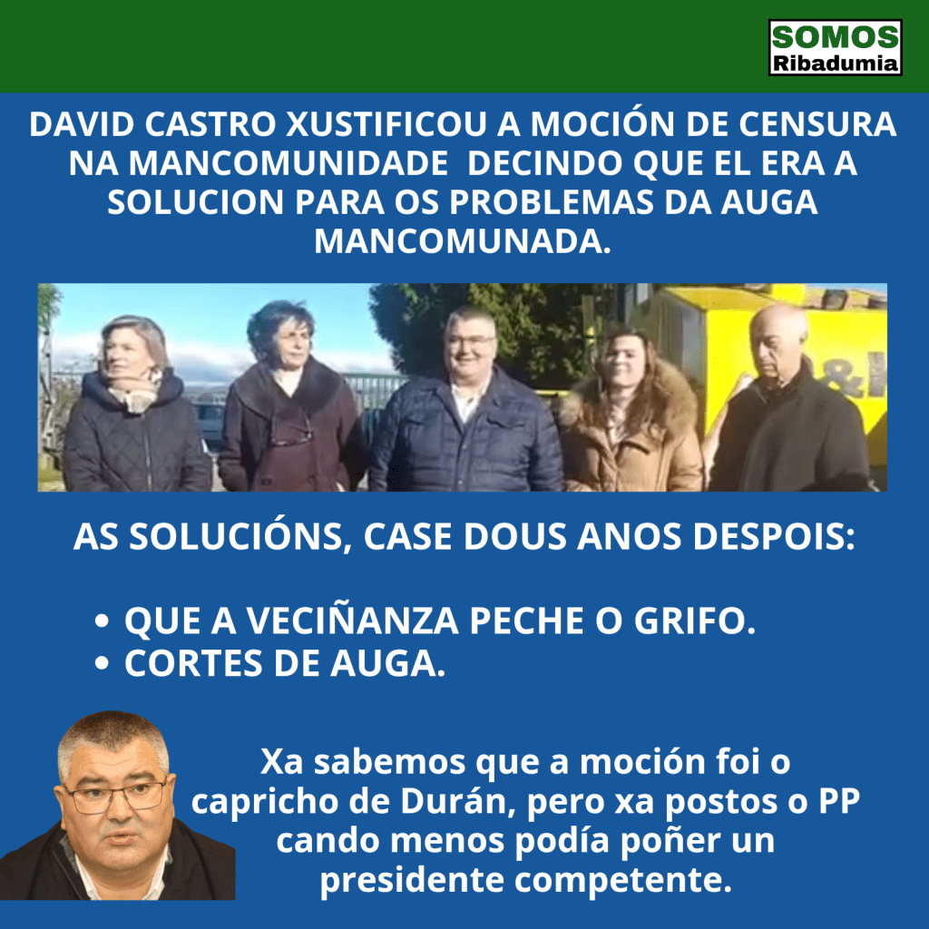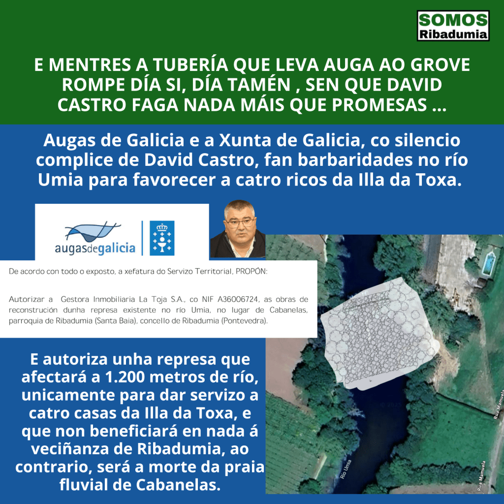 Pasaron os meses e, do mesmo xeito que pasou en Ribadumia todo era fume. Moitos anuncios de investimentos de cifras rechamantes pero sen poñer nun papel, non digamos xa nos orzamentos da Xunta, e tamén moita foto. Pero solucións cero. De feito, David Castro da moitas largas e evita resolver o problema da conexión co grove ao mesmo tempo que favorece melloras na captación que hai en Cabanelas para dar servizo á Illa da Toxa, algo que nos parece moi lamentable.