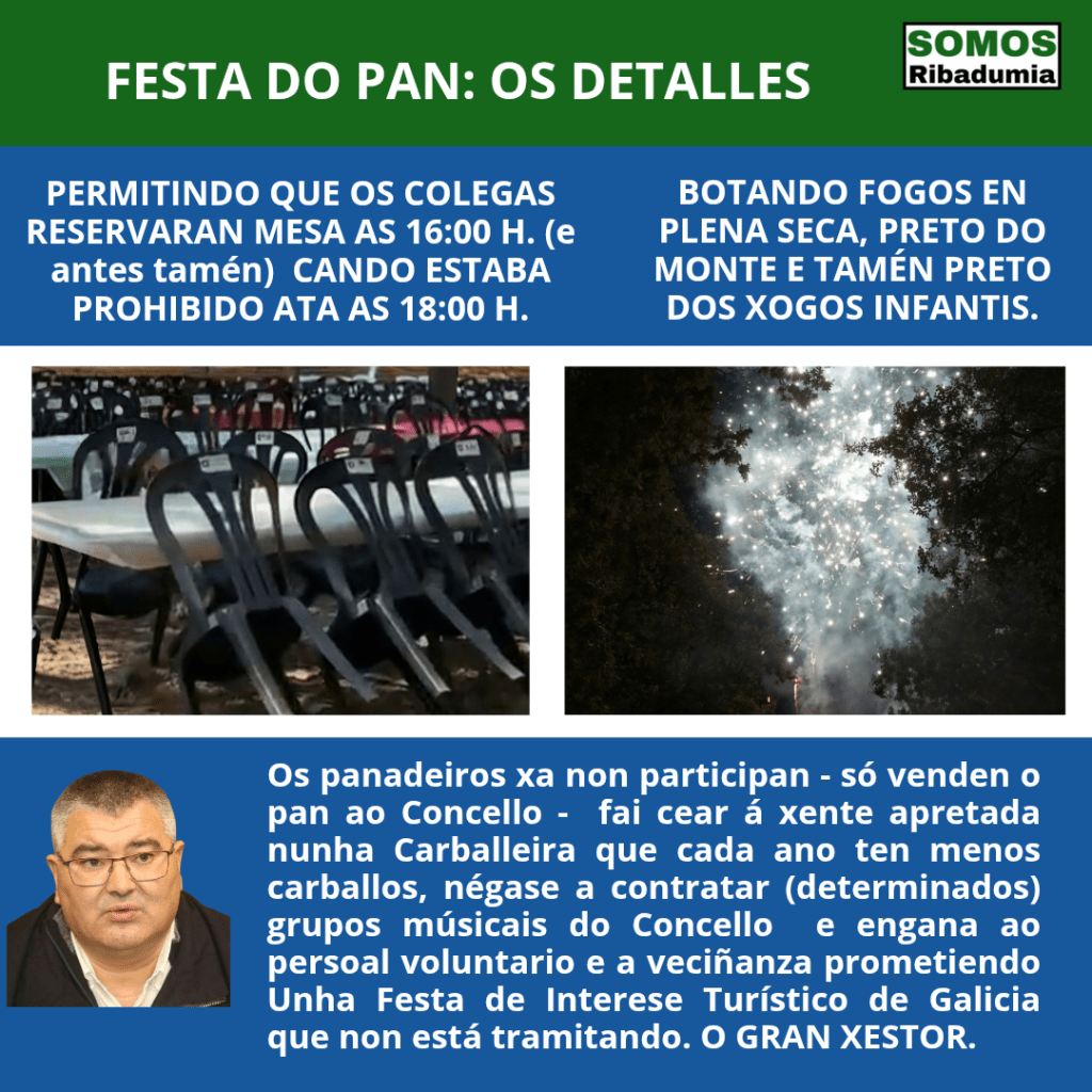 Dende Somos Ribadumia temos moi claro que a Festa do Pan merece unha revisión a fondo, e tamén un goberno que traballe por poñer en valor a nosa tradición muiñeira e de elaboración deste produto, actualizando o evento, tendo coidado con certos detalles, e dándolle un valor engadido que permita manter unha boa afluencia de xente, pero que ese non sexa o único obxectivo, e que tampouco sexa tan alta que impida á nosa veciñanza gozar dese evento con tranquilidade, isto é: sen ter que facer colas longas, andar as liortas por coller un par de cadeiras ou comer apertados, entre outras cousas.