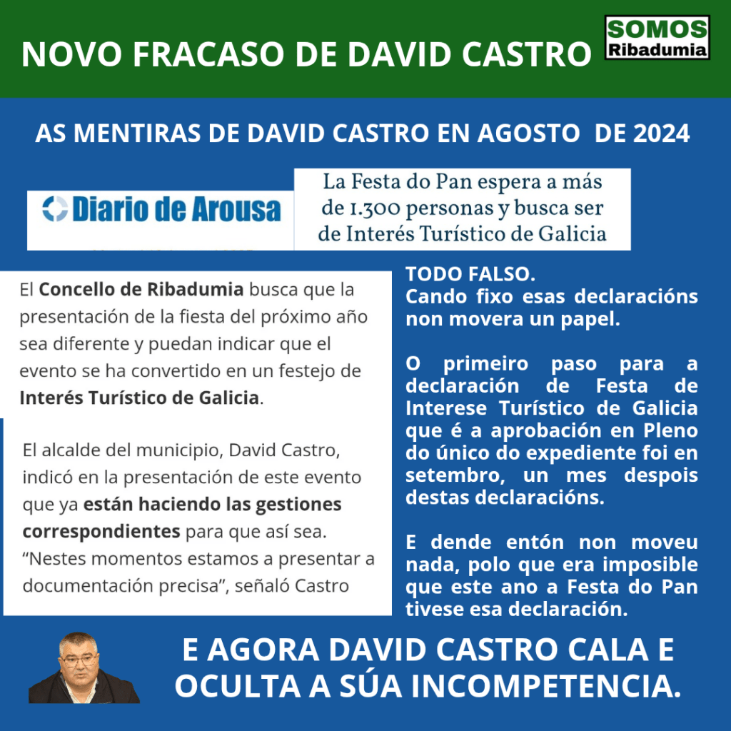 Pasou a Festa do Pan, e parecera que David Castro quixera obviar que aconteceu. Dende Somos Ribadumia, como sempre, optamos por agardar un tempo prudencial, antes de facer unha valoración, e evitar así afectar de ningunha maneira ao evento, pero a realidade é que David Castro vai de fracaso en fracaso.