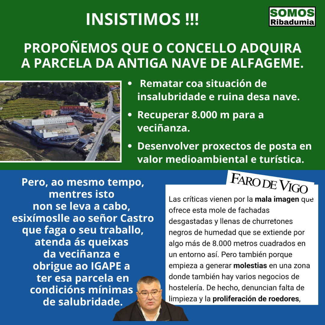 No seu momento presentamos unha moción no Concello, que David Castro ocultou nun caixón xunto a outras sete mocións do noso partido e algunha máis doutros partidos da oposición, onde propoñiamos que o Concello se fixera coa parcela da ántiga Alfageme e a recuperase para a veciñanza e como reclamo turístico dentro dun plan a medio prazo.