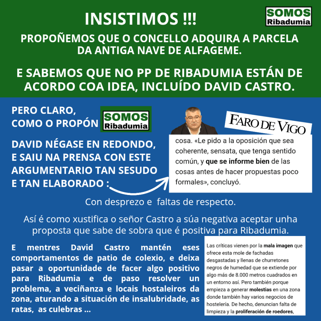 David Castro decidiu que non vai aceptar ningunha proposta que saia de Somos Ribadumia, polo que a pesar de aceptar en privado que a proposta é máis que interesante, decidiu non facer nada. Non so o decidiu, esta mañá apareceron unhas declaracións nun medio de prensa onde non so desbota a idea de facerse con esa parcela, senón que como argumentario, o único que se lle ocorre é acudir á descalificación e o desprezo cara o noso partido.