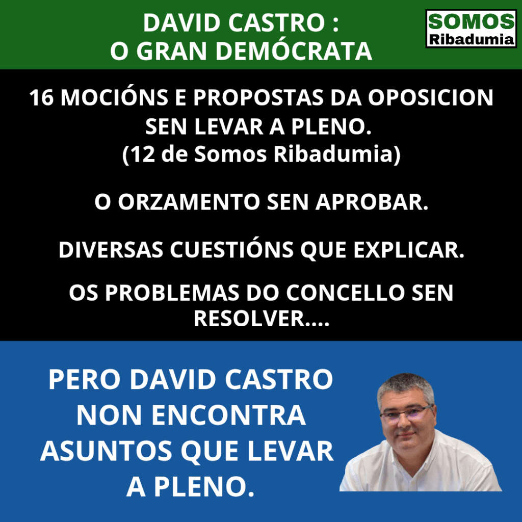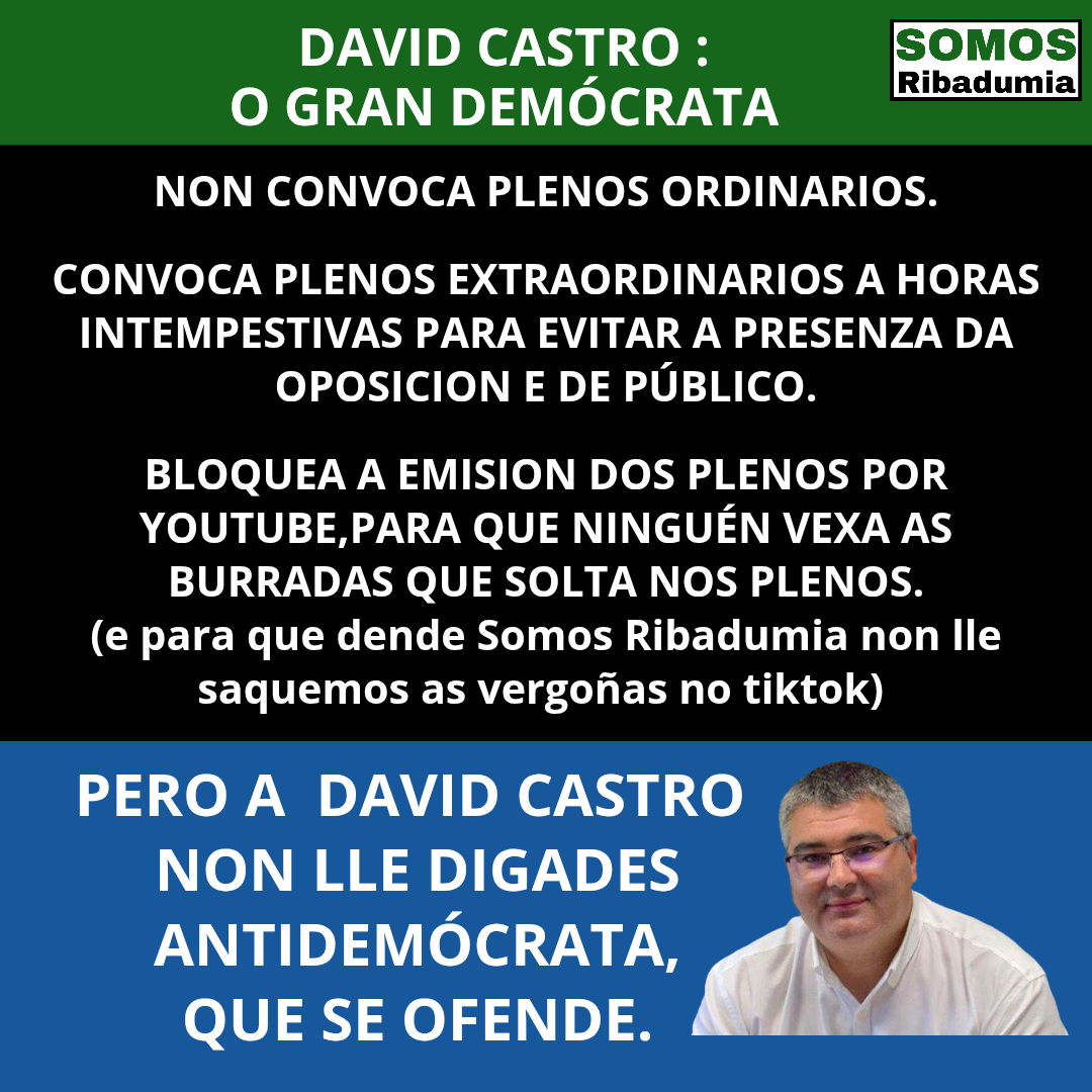 Dende Somos Ribadumia queremos por de manifesto a situación totalmente antidemocrática e anómala que vive Ribadumia gracias aos feitos de David Castro, decidido a rematar con calquera funcionamento democrático.