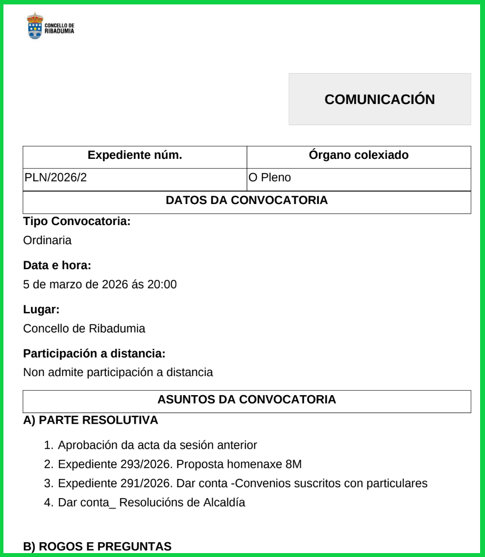 O que non inclúe a convocatoria, cuxo contido decide en exclusiva Alcaldía, que é quen ten a competencia para facelo, é a obrigatoria dación de contas da situación económica do Concello, que leva sen incluírse na Orde do Día dos Plenos dende o pasado mes de maio. Non é unha cuestión menor , pois o ultimo dato publicado no ministerio, de setembro de 2025, sitúa o PMP en 99 días, triplicando o máximo legal establecido.