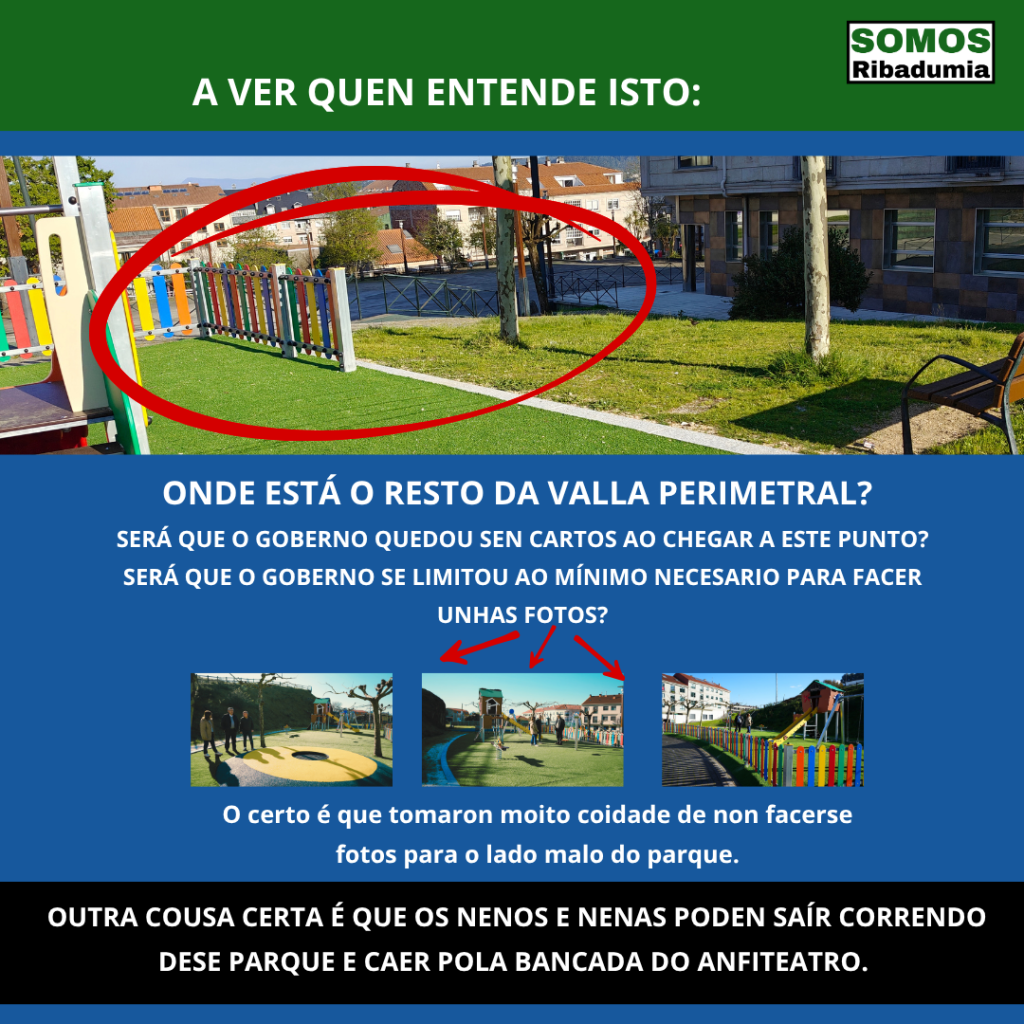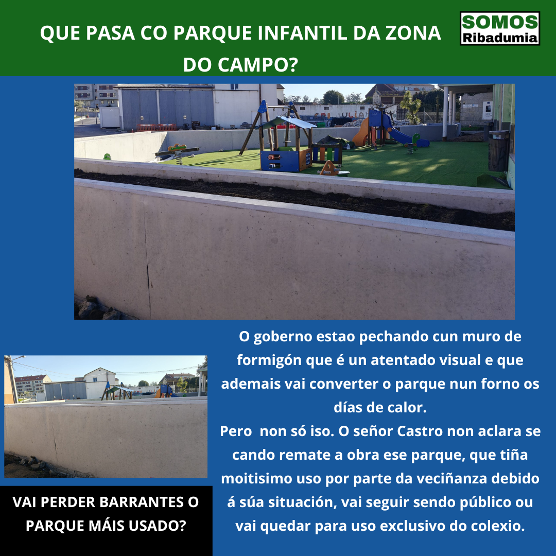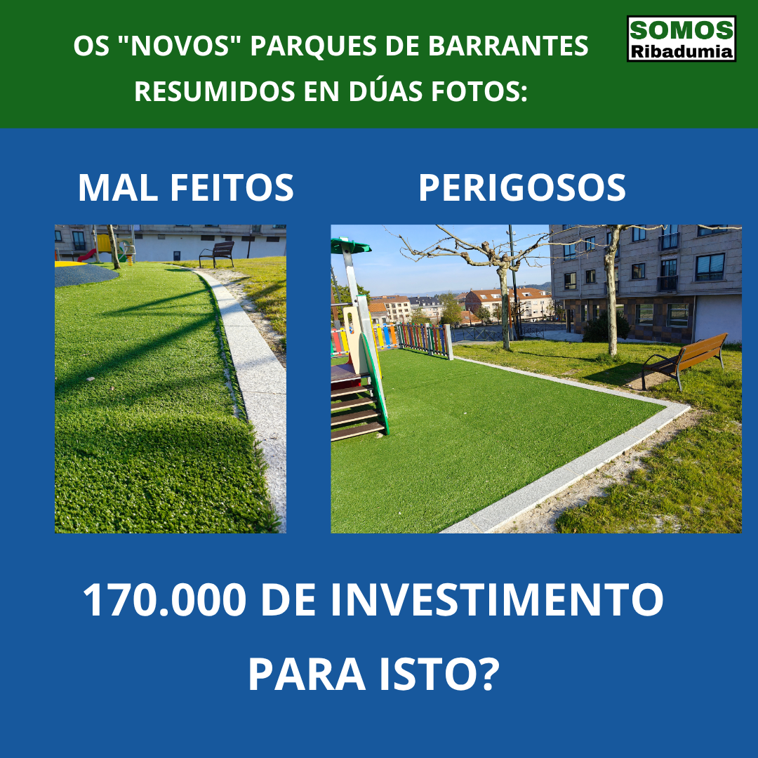 Ou sexa, hoxe Barrantes ten menos parques infantís, e os que ten son cutres e perigosos. Dende Somos Ribadumia esiximos ao goberno local que como mínimo corrixa as deficiencias de seguridade dos parques, coloque vallas de seguridade onde corresponda, elimine todo o que supoña un perigo, corrixa as deficiencias das soleiras, e recoloque os xogos que poidan resultar un perigo pola súa situación. E dende logo, esiximos saber que vai pasar co parque sito na zona do Colexio, que en calquera caso ao remate da obra manteña a súa función como parque público, e que se corrixa o aberrante muro que se está realizando para evitar que ese parque se converta nun forno mal ventilado nos días de sol.