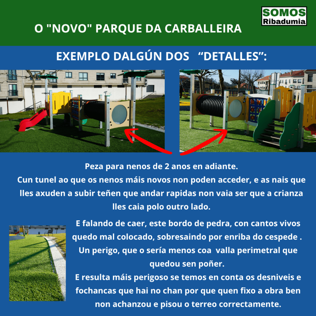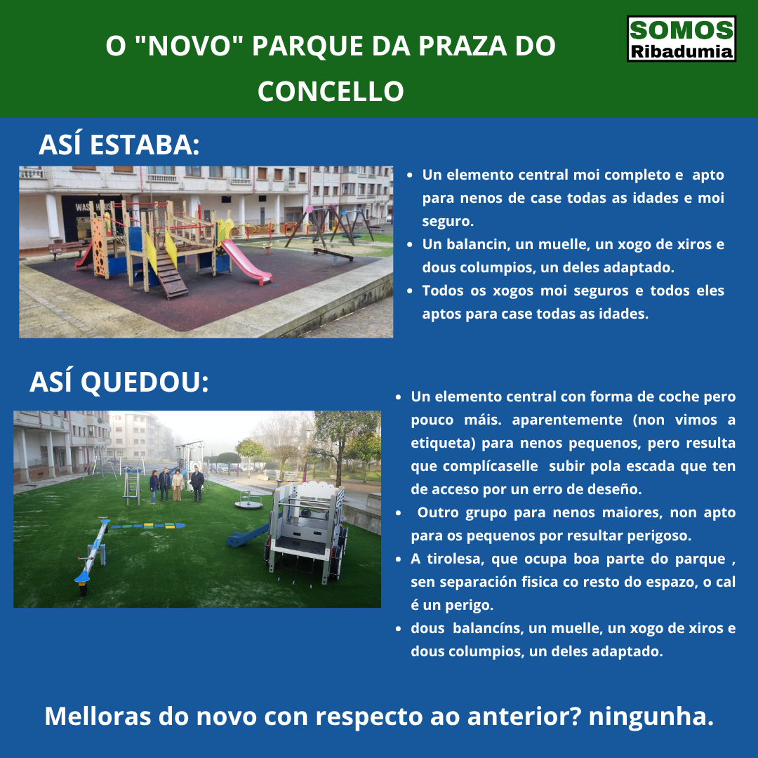 Dende Somos Ribadumia levamos meses recollendo a opinión de nais e pais sobre as reformas realizadas nos dous parques infantís de Barrantes, e tamén a preocupación polo que o goberno do señor Castro está realizando no terceiro parque, sito na contorna do colexio.