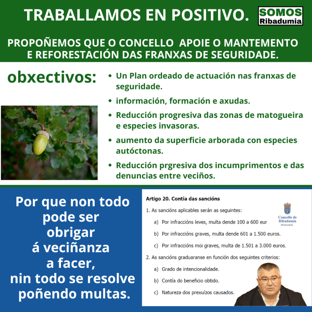 - Presentamos unha moción propoñendo un plan con liñas económicas e asesoramento para favorecer a reforestación con especies autóctonas desas franxas de seguridade.