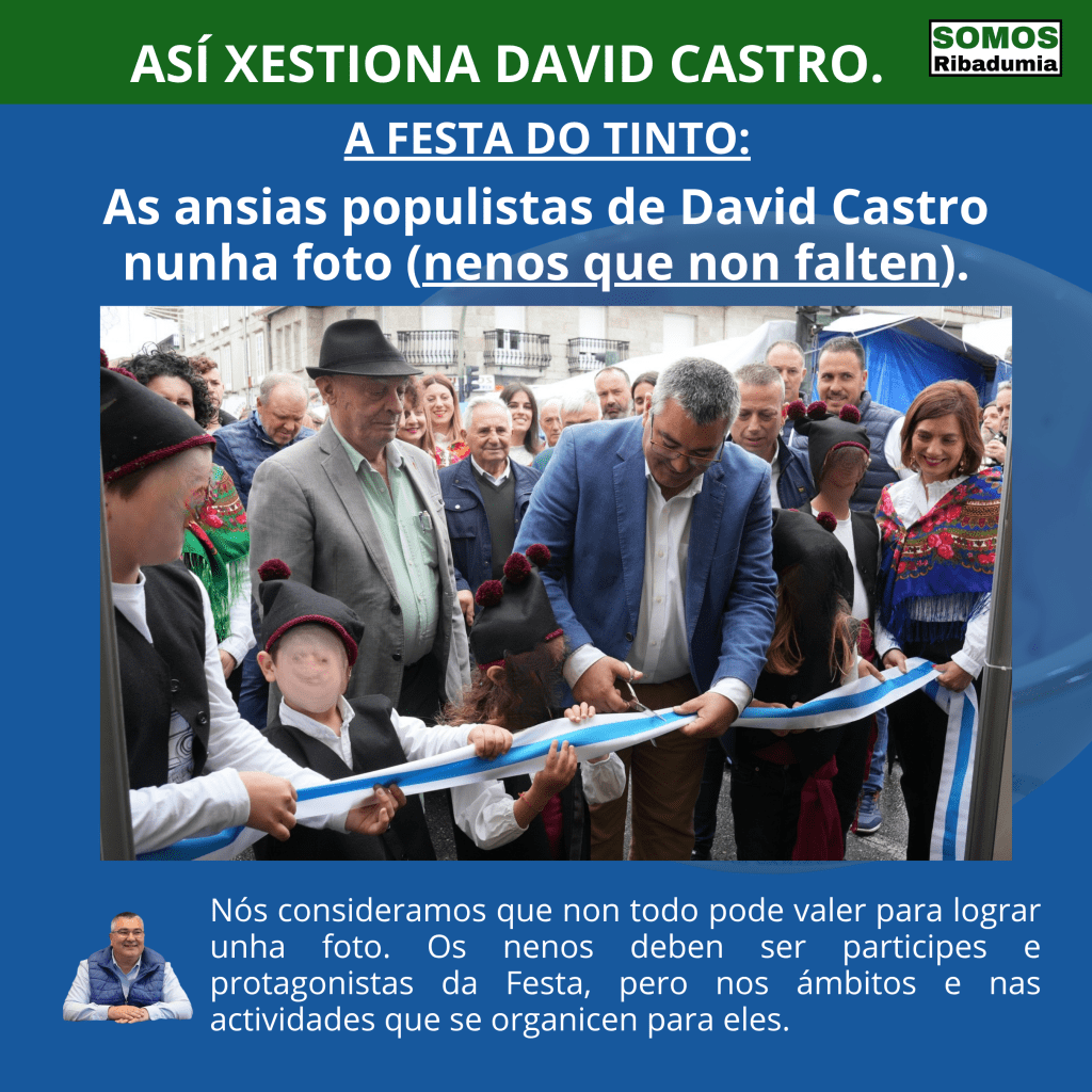 Comezando por aspectos organizativos, debemos lamentar varias cuestións. Por un lado dende a nosa formación seguimos sen ver correcto que nos actos de inauguración dunha Festa destas características haxa que poñer menores como puxo David Castro. Certo que este ano participaron moitos menos nenos e nenas e que o alcalde non caeu na populista tentación de poñelos no brinde inicial como o ano pasado, pero con todo consideramos que tampouco foi adecuado que estiveran no corte da cinta. David Castro debería ir madurando un pouco como político, porque por moi populista que queira ser, hai cousas que non son correctas.