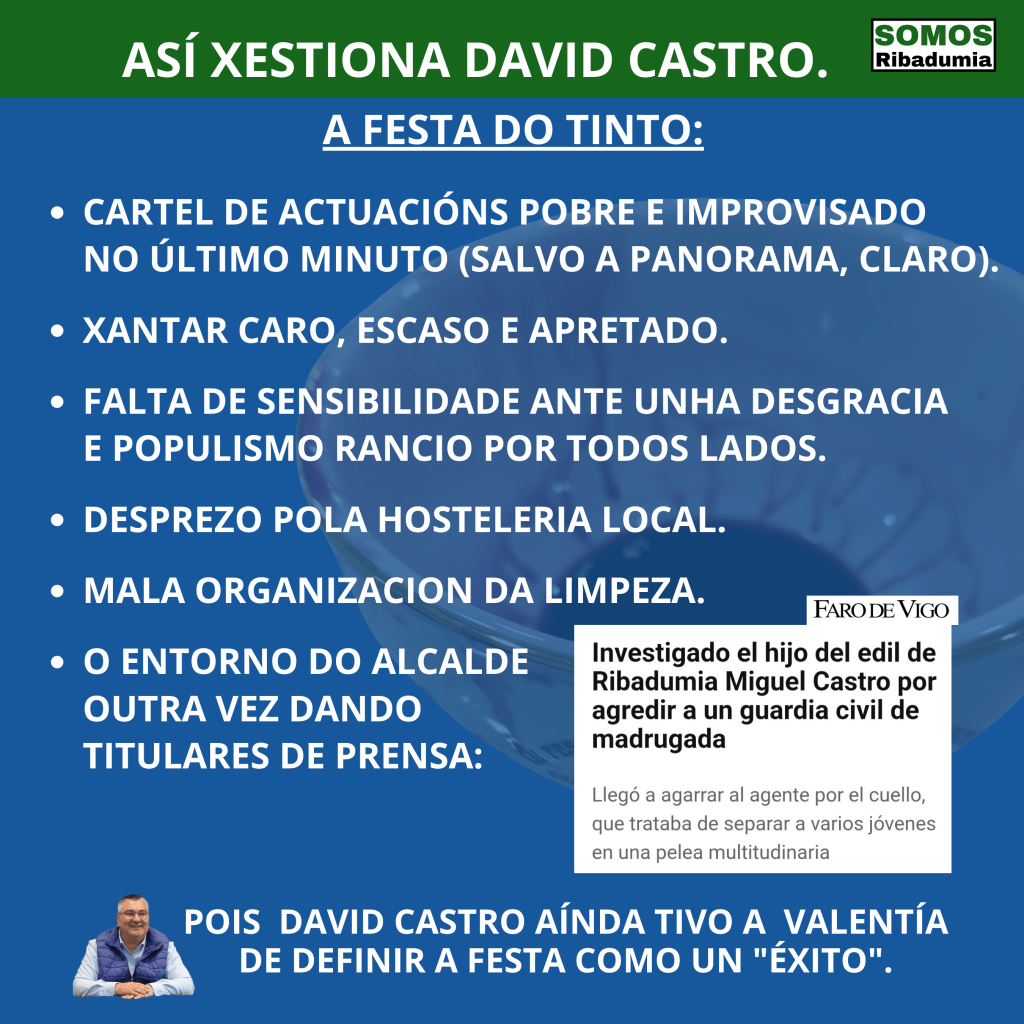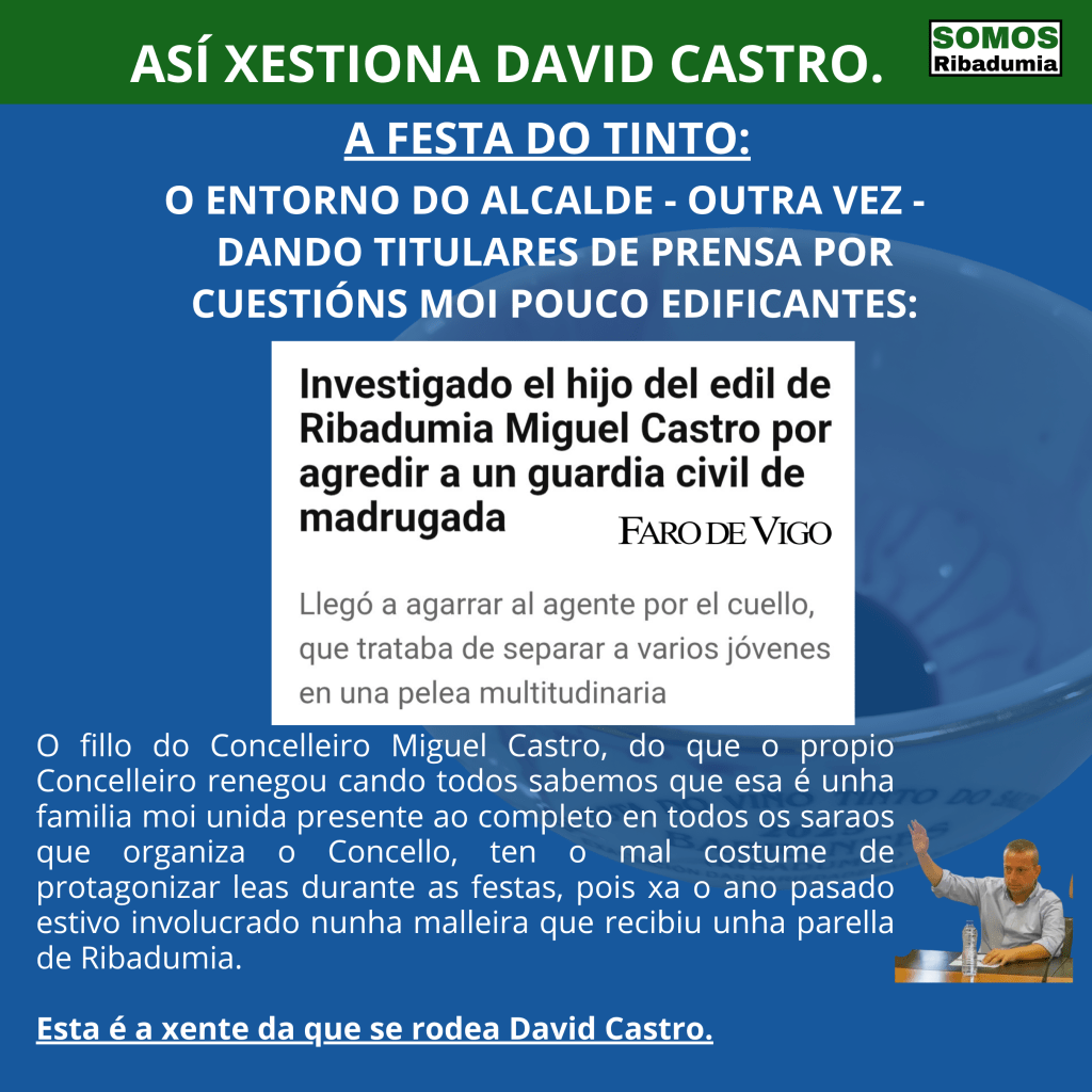 Por outra banda está o problema creado polo entorno de David Castro con líos coas forzas de seguridade do estado que emborronaron a festa . Dende Somos Ribadumia asumimos que nas festas onde se xunta moita xente, e moita xuventude, poida haber algunha liorta. Son cousas ata certo punto inevitables. Este ano déronse varias liortas e en xeral a sensación que nos transmitiron hostaleiros e asistentes á festa foi de que a presenza policial foi quizais máis discreta que anos anteriores, sen con isto desmerecer o bo traballo e a correctísima atención da Garda Civil con hostaleiros e asistentes. Pero o que non se pode aceptar é que sexa xente do entorno do goberno local a que acapare titulares por supostamente atacar a un Garda Civil. Nin moito menos que se pretenda botar terra por enriba dun asunto tan grave. Debemos remarcar que o fillo do Concelleiro involucrado neste feo asunto, forma parte da comitiva habitual do goberno, xunto a outros membros desa mesma familia que están ou colaboran en todos os eventos e actos públicos. Este individuo non é pois alguén alleo nin ao Concelleiro nin ao goberno nin ao señor Castro. Ademais ese mesmo individuo é xa un habitual nas pelexas durante a festa do Tinto, pois xa o ano pasado estivo implicado nunha palleira a unha parella de Ribadumia. Tampouco é o primeiro problema que ten o equipo de goberno e o propio Castro coa autoridade . Recordemos que David Castro montou unha festa na súa casa en plena pandemia con medio centenar de persoas cantando alegremente en plena noite nun momento onde as xuntanza estaban restrinxidas e os ataques desa noite a Enrique Oubiña, protagonizados polo irmán doutra Concelleira do equipo do señor Castro. E non esquecemos episodios do propio Miguel Castro atacando e ameazando ao noso anterior concelleiro, un episodio que rematou no xulgado, ao que seguiron outros como a súa muller e nai do individuo que supostamente atacou a un garda civil durante a festa ameazando nos plenos membros do noso partido .