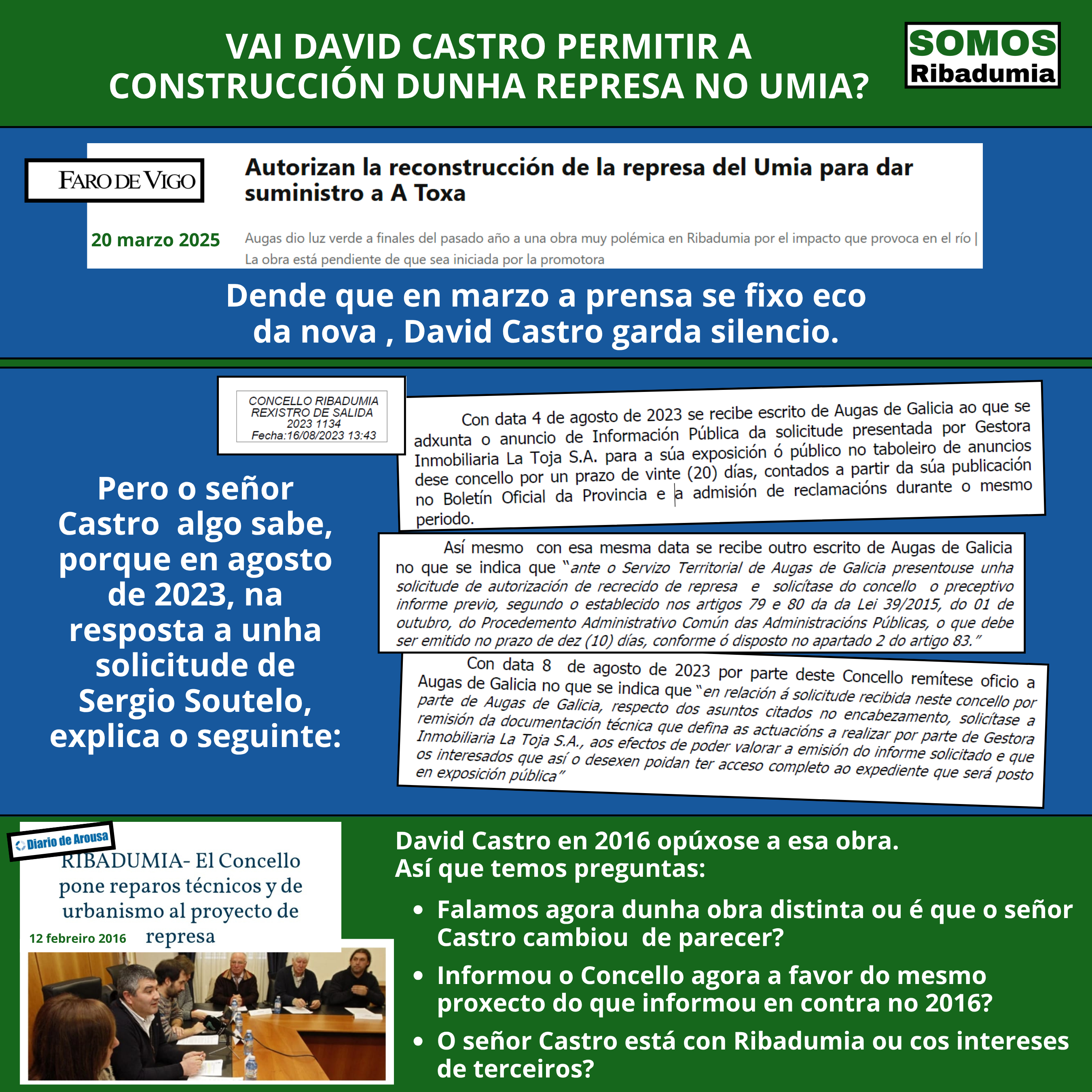 Pola nosa banda mantemos a nosa oposición a que se realicen este tipo de obras polas consecuencias negativas que tería en todos os aspectos: obviamente os medioambientais ao afectar gravemente ao cauce do río, e polo tanto á flora e fauna que nel conviven, e por extensión á pesca; implicaría un aumento dos desbordamentos invernais en Cabanelas e Oubiña, suporía a desaparición da praia fluvial de Cabanelas e deixaría ao club O Muiño sen unha das súas zonas de entrenamento e ao noso Concello sen un dos seus puntos emblemáticos, por non falar das repercusións negativas de ter tamaño mamotreto no medio da senda fluvial do río Umia e da variante espiritual do Camiño de Santiago que tantas persoas percorren a diario. Por iso, onte mesmo presentamos un escrito solicitando, primeiro, que David Castro dea explicacións e aclare a situación, e segundo, acceso a toda a documentación relacionada con este tema. En concreto, solicitamos o seguinte: