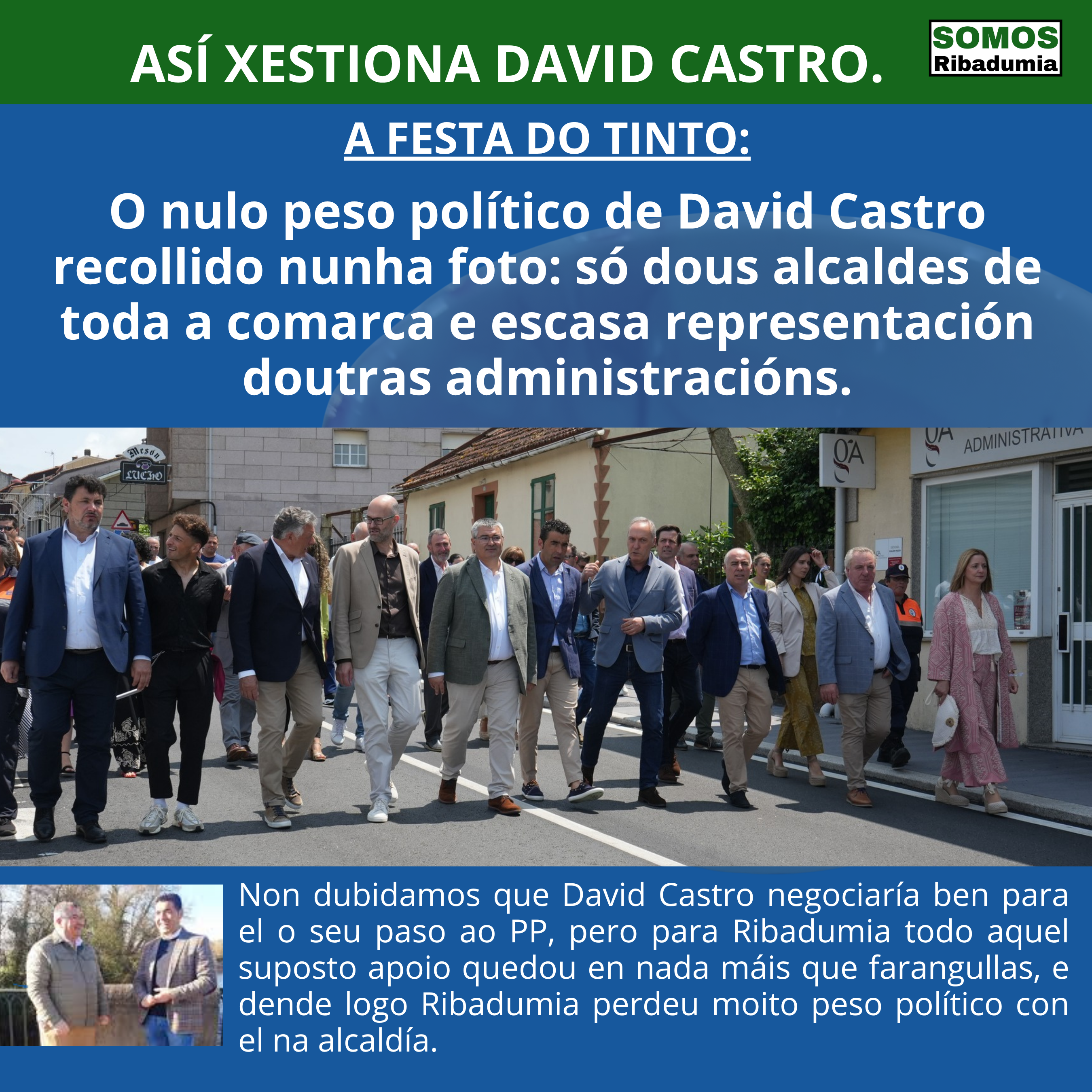 Non deixamos pasar tampouco a constatación do escaso peso político que o señor Castro ten tanto no seu partido como na comarca, abandonado por uppkjh boa parte dos representantes políticos que evitaron aparecer preto do señor Castro, coa salvidade do presidente da Deputación que entendemos terá que pagar algo pola compra no 2023 do señor Castro. En calquera caso é moi significativo que a estas alturas o señor Castro aínda non recompuxera as súas relacións co resto de alcaldes e alcaldesa da comarca, incluídos os do seu partido. Ribadumia, con este alcalde, perde moito peso na comarca, e iso estase notando no retroceso en todos os aspectos.