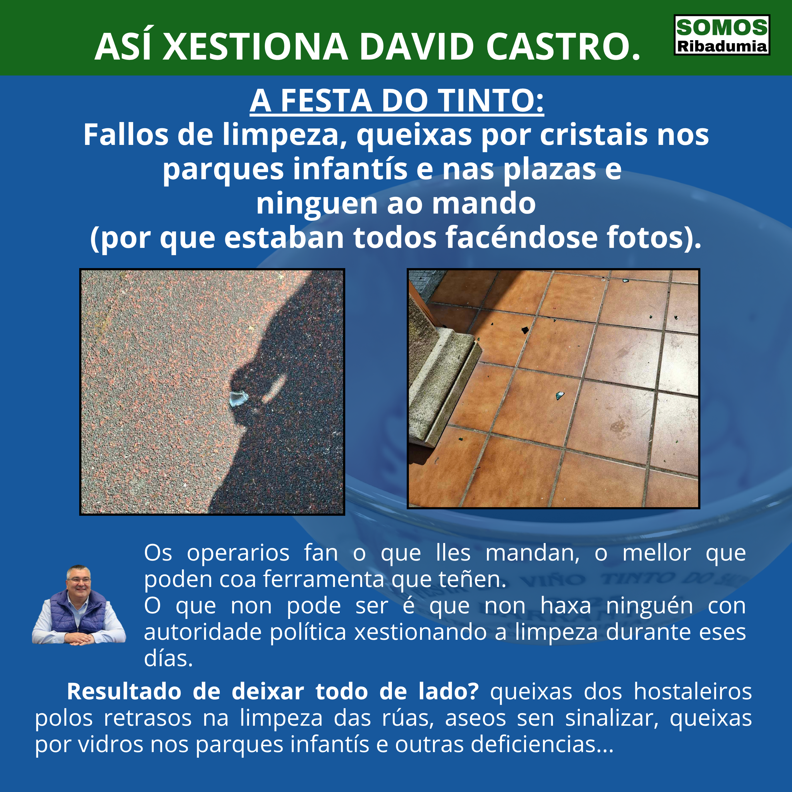 Dende Somos Ribadumia temos claro que hai un problema coa xestión da limpeza no Concello, un problema de carácter político pola desidia de quen nos goberna, máis interesado nos palcos e nas fotos que na xestión do día a día do noso Concello, e pedimos que se actúe antes de que teñamos un problema real, ou que unha inspección nos peche unha instalación.