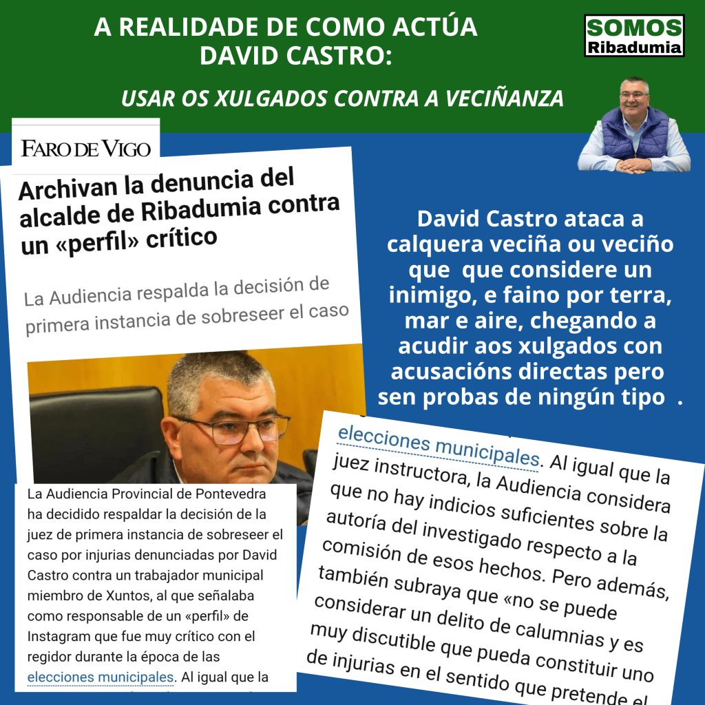 Outra cuestión distinta é que David Castro se dedique a denunciar a calquera que o critique, con acusacións graves, realizando sinalamentos públicos buscando “xuizos paralelos” na opinión pública, pero sen aportar probas que fundamenten eses sinalamentos, como se mira neste caso, que non foi o primeiro. Pendente está unha denuncia contra outro perfil nas redes do que pretende responsabilizar ao noso voceiro Enrique Oubiña, outro episodio en campaña que tamén denunciou e que rematou igual que o que hoxe nos ocupa, ou a denuncia interposta no 2022 tamén contra Enrique Oubiña e Somos Ribadumia por denunciar publicamente os problemas durante o verán coa auga pública e que foi arquivada sen admitirse a trámite por absurda.