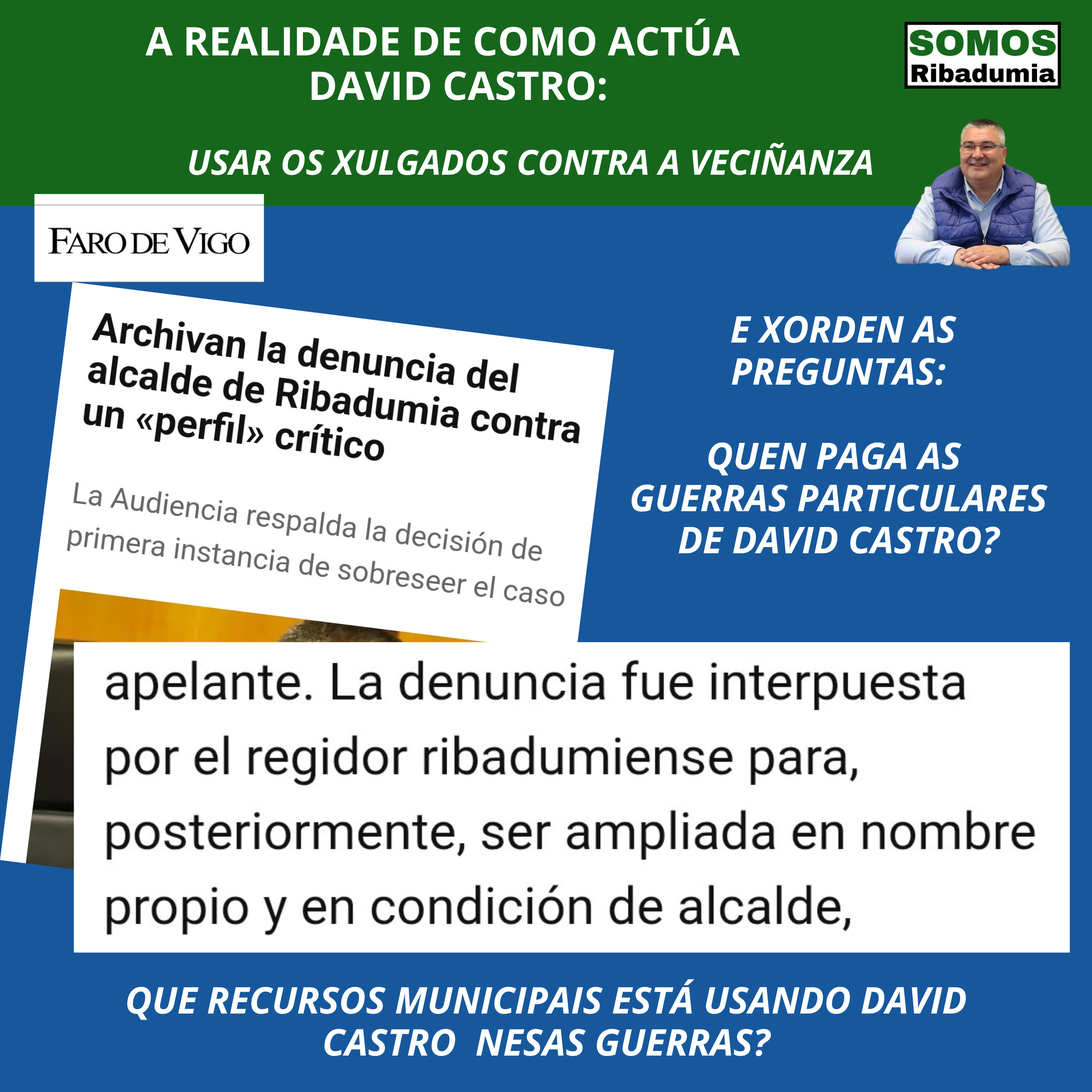 Outra cuestión distinta é que David Castro se dedique a denunciar a calquera que o critique, con acusacións graves, realizando sinalamentos públicos buscando “xuizos paralelos” na opinión pública, pero sen aportar probas que fundamenten eses sinalamentos, como se mira neste caso, que non foi o primeiro. Pendente está unha denuncia contra outro perfil nas redes do que pretende responsabilizar ao noso voceiro Enrique Oubiña, outro episodio en campaña que tamén denunciou e que rematou igual que o que hoxe nos ocupa, ou a denuncia interposta no 2022 tamén contra Enrique Oubiña e Somos Ribadumia por denunciar publicamente os problemas durante o verán coa auga pública e que foi arquivada sen admitirse a trámite por absurda.