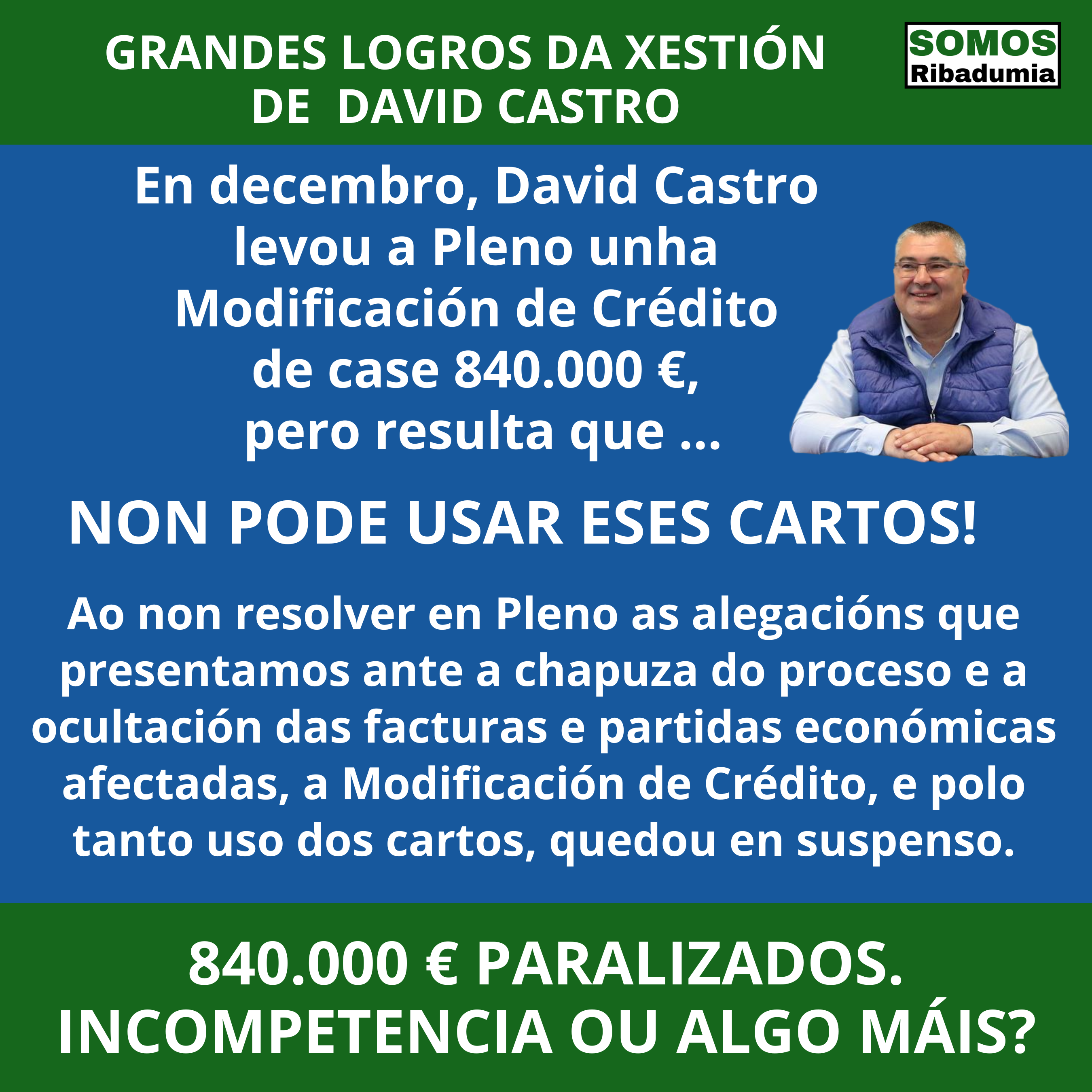 O motivo de que a modificación de crédito estea paralizada é que o señor Castro está incumprindo a súa obriga de levar a Pleno as alegacións presentadas ante ese documento, en concreto as presentadas pola nosa formación.
