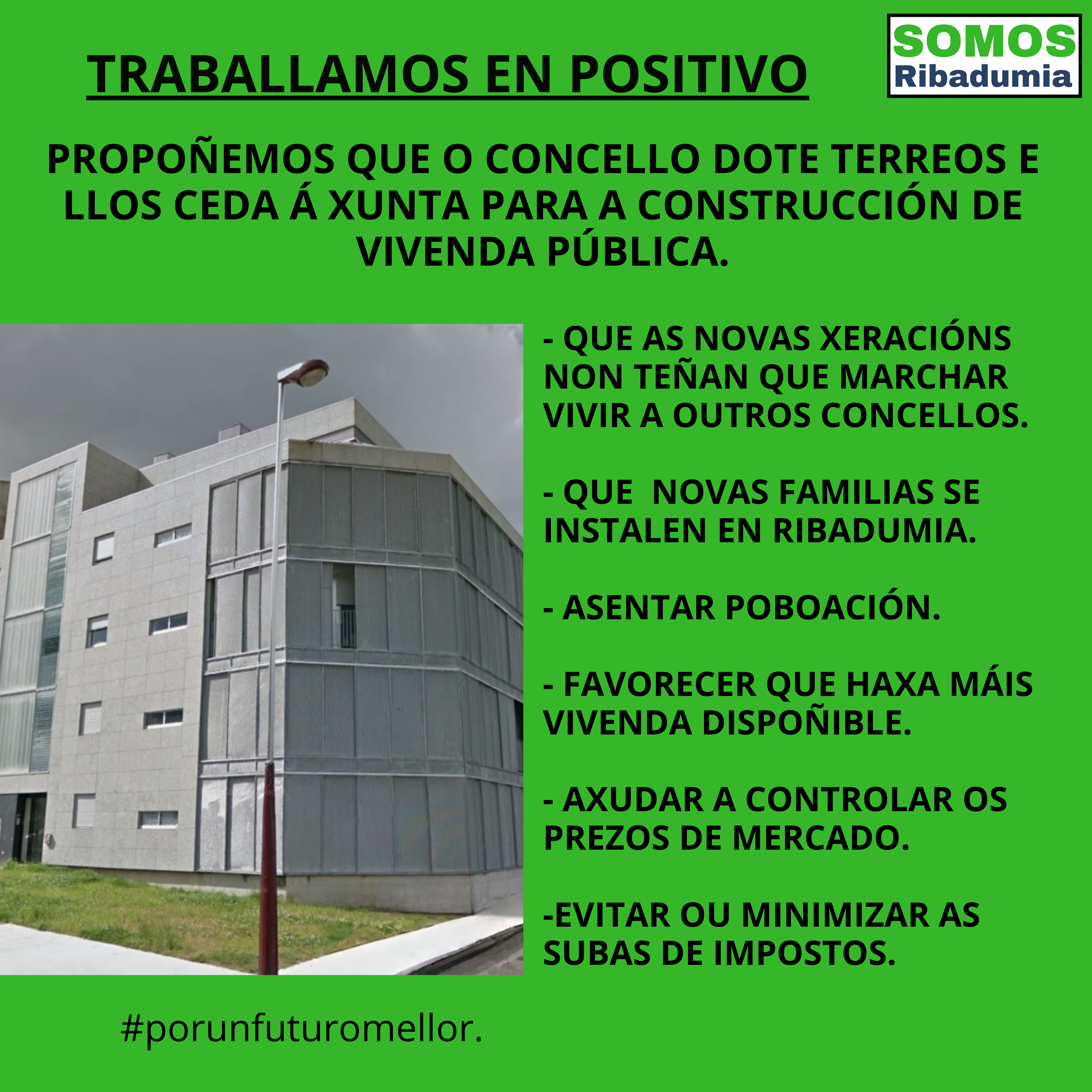 · Propoñemos dotar terreos e ofrecerllos á Xunta para o seu plan de construción de vivendas públicas.