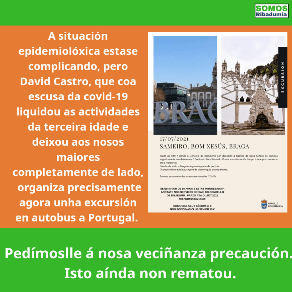 Dáse a circunstancia de que estamos asistindo a un repunte da pandemia, con aumento de casos no noso concello e no resto da área sanitaria, que xa levou ao goberno a Xunta aumentar o nivel restritivo en varios Concellos veciños. Por outra banda, o país veciño a pasada fin de semana volveu aumentar as medidas de restrición en varias cidades debido a alta incidencia da enfermidade, unha delas precisamente Braga, destino a excursión anunciada.