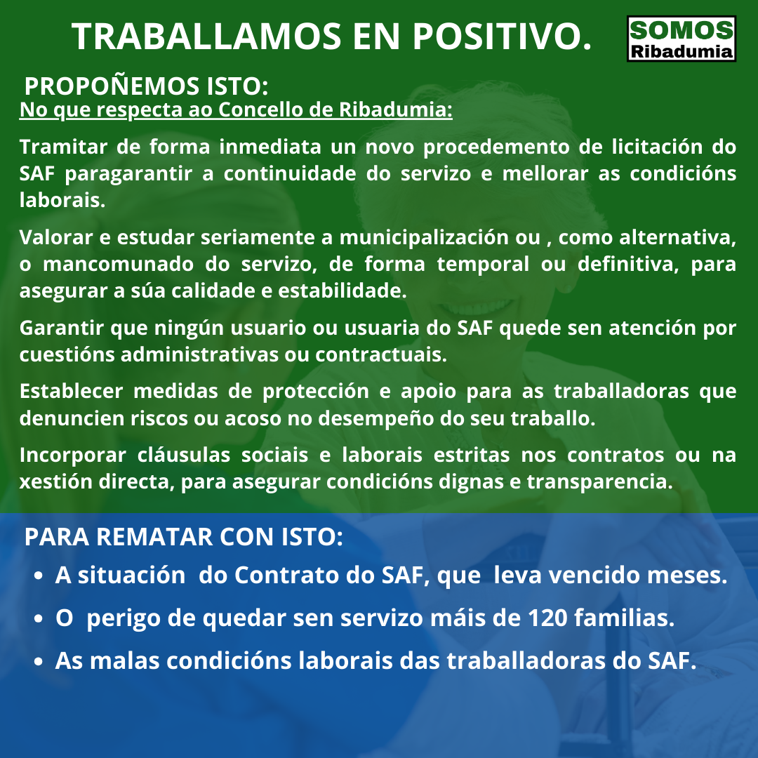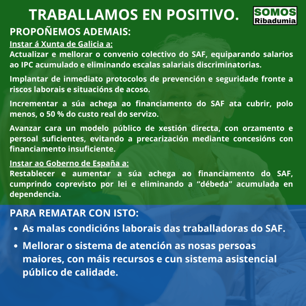 Ribadumia non pode permitirse nin un día máis sen garantías de continuidade do SAF, sen medidas de protección para as traballadoras, e sen compromiso firme por un servizo digno e seguro para quen o precisa. Por ses motrivo, ante a habitual desidia do goberno local, dende a nosa agrupación presentamos esta semana unha moción para o seu debate en Pleno, onde propoñemos o seguinte: