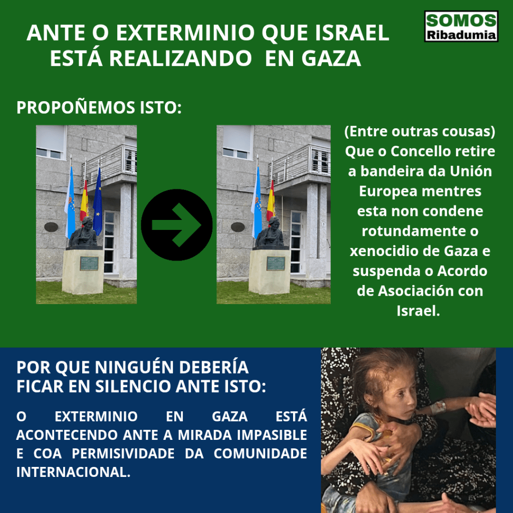– O Concello de Ribadumia retirará a bandeira da Unión Europea da entrada do Concello, mentres a Unión Europea non condene con rotundidade o xenocidio que está cometendo Israel en Gaza e non suspenda o Acordo de Asociación con ese Estado.