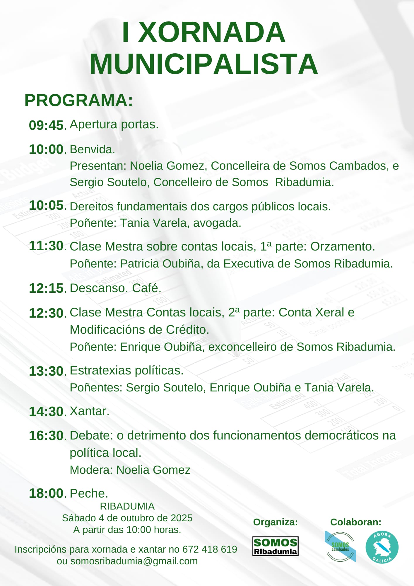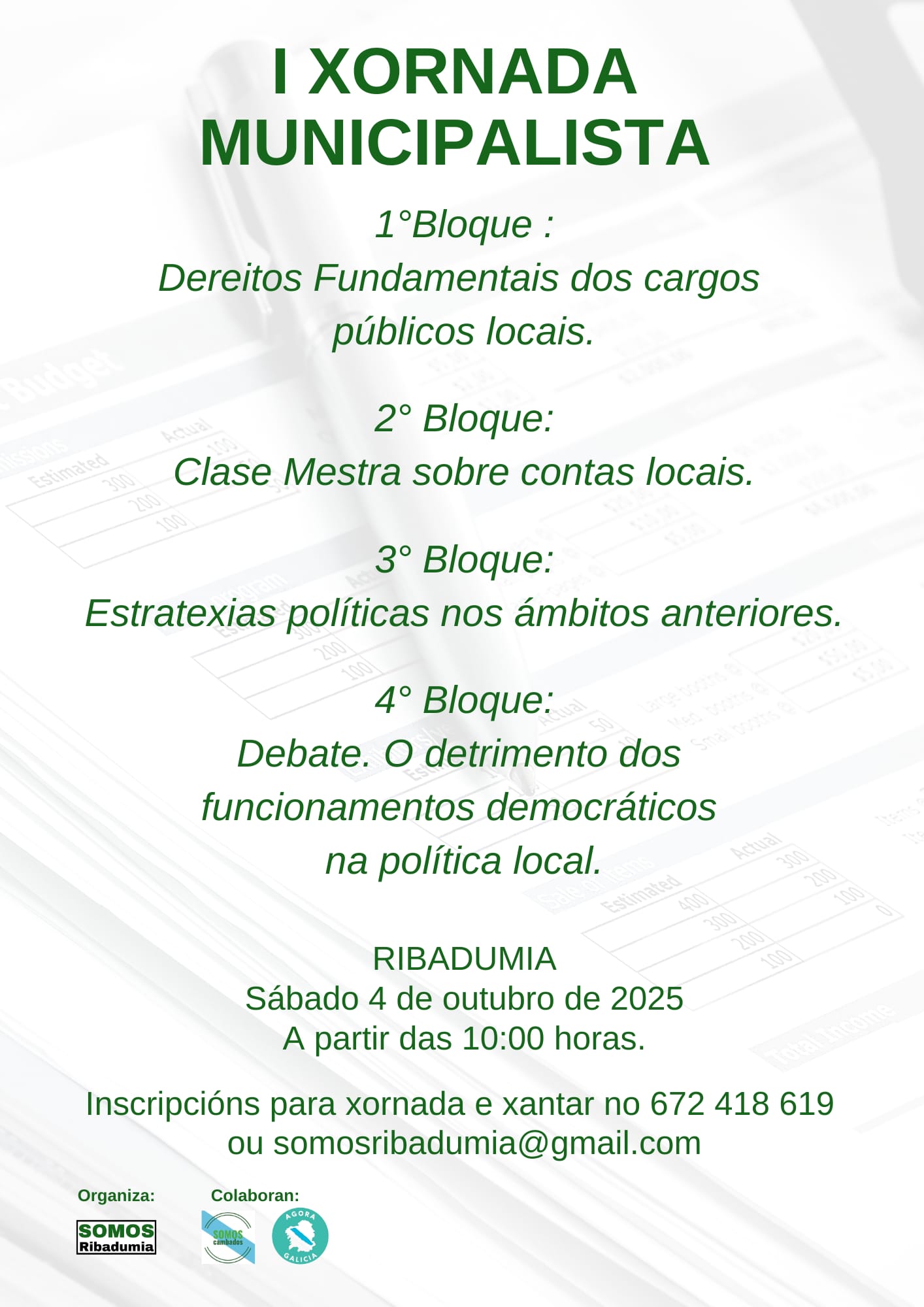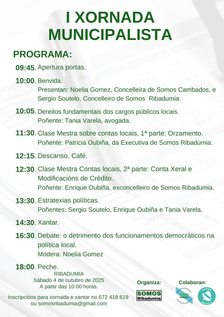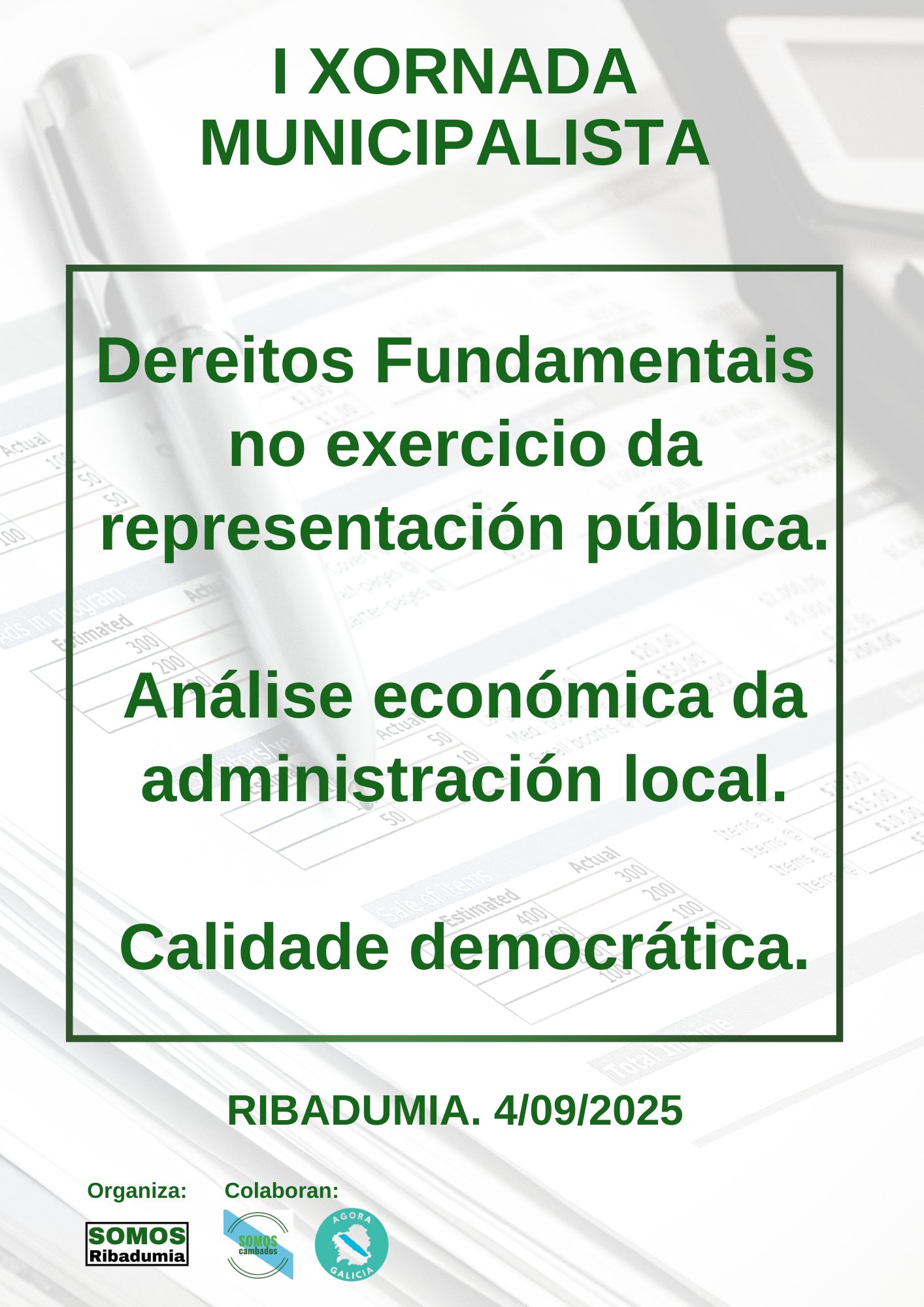 Dende Somos Ribadumia vimos de lanzar, logo de meses de preparación, a que será a I Xornada Municipalista, un encontro de carácter técnico, formativo e de debate que supón un paso adiante no traballo colectivo que vimos realizando dende fai anos con outras formacións do noso espazo político, e que se encadra dentro do proxecto de confederación do municipalismo iniciado formalmente o pasado febreiro co nacemento de Agora Galicia.
