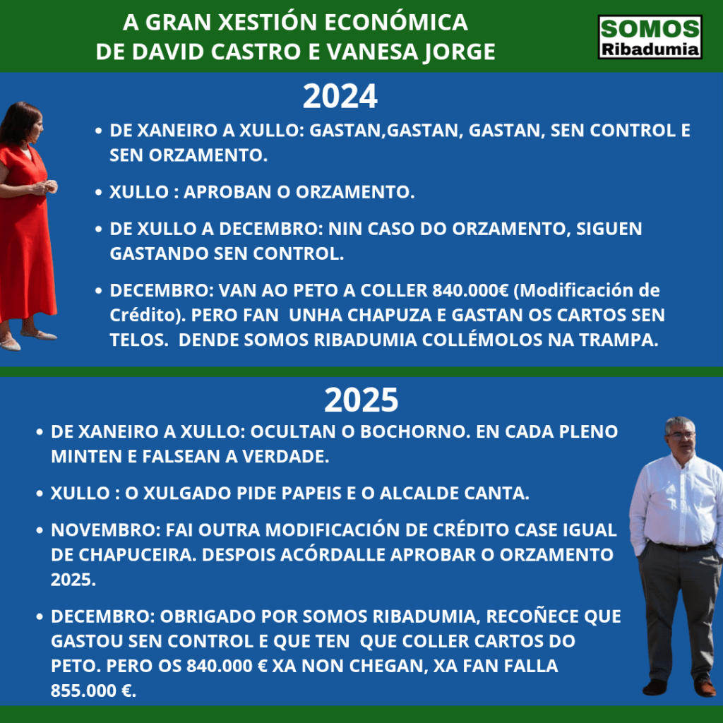 O que temos claro dende Somos Ribadumia é que entre as nosas obrigas está a de garantir unha correcta xestión económica, parella a unha correcta xestión do Concello. As malas xestións económicas e o mal goberno, e temos exemplos en Concellos veciños como Vilanova, o que poden e van traer son subas de impostos para facer fronte ao desastre da xestión do goberno actual.